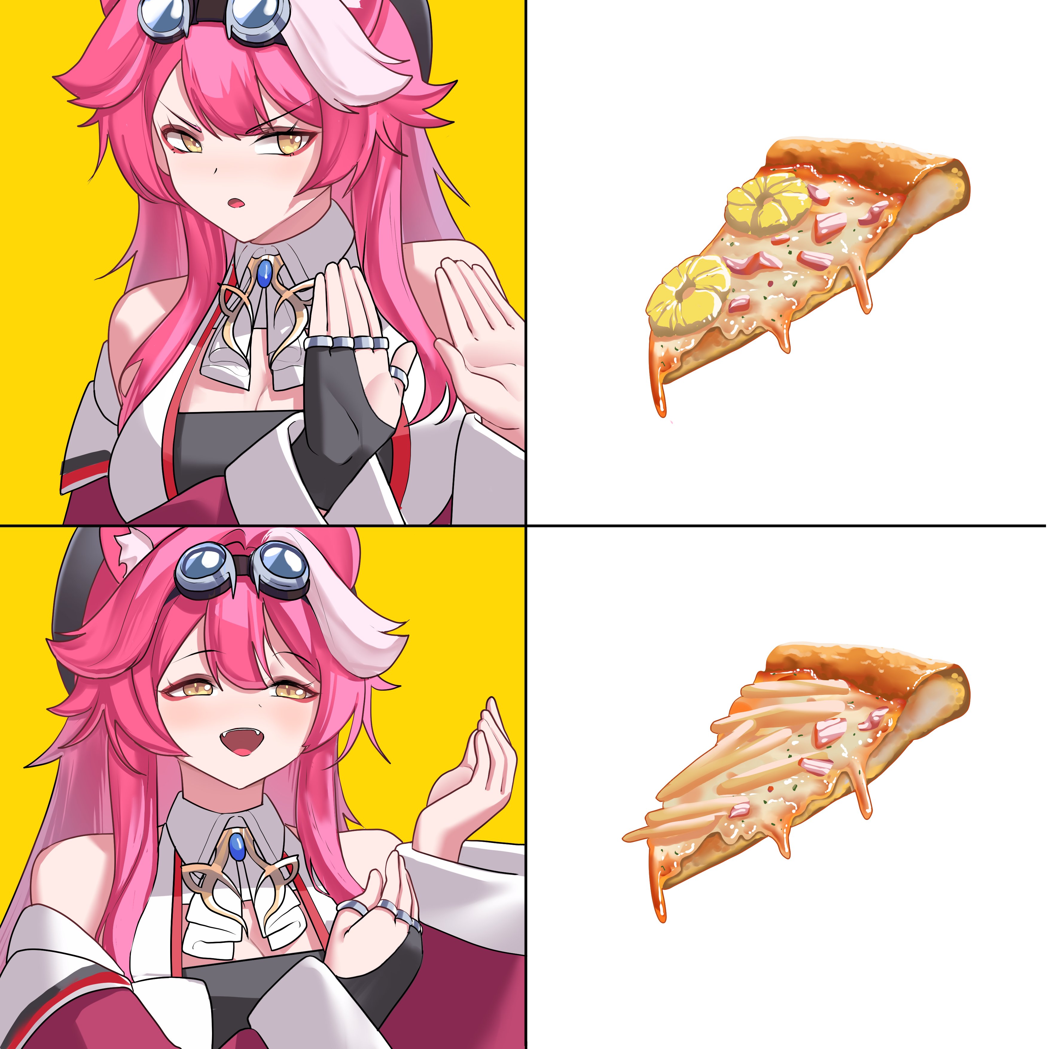 1girl :d absurdres animal_ear_fluff animal_ears beret black_gloves che_vuoi?_(italian_gesture) crimes_against_food drakeposting_(meme) food french_fries fruit gloves goggles goggles_on_head gold hands_up hat hawaiian_pizza highres hololive hololive_english jewelry long_hair meme multicolored_hair open_mouth panther_ears panther_girl pineapple pineapple_on_pizza pink_hair pizza rait_visual_works raora_panthera raora_panthera_(1st_costume) ring smile streaked_hair upper_body v-shaped_eyebrows vest virtual_youtuber white_vest yellow_background yellow_eyes