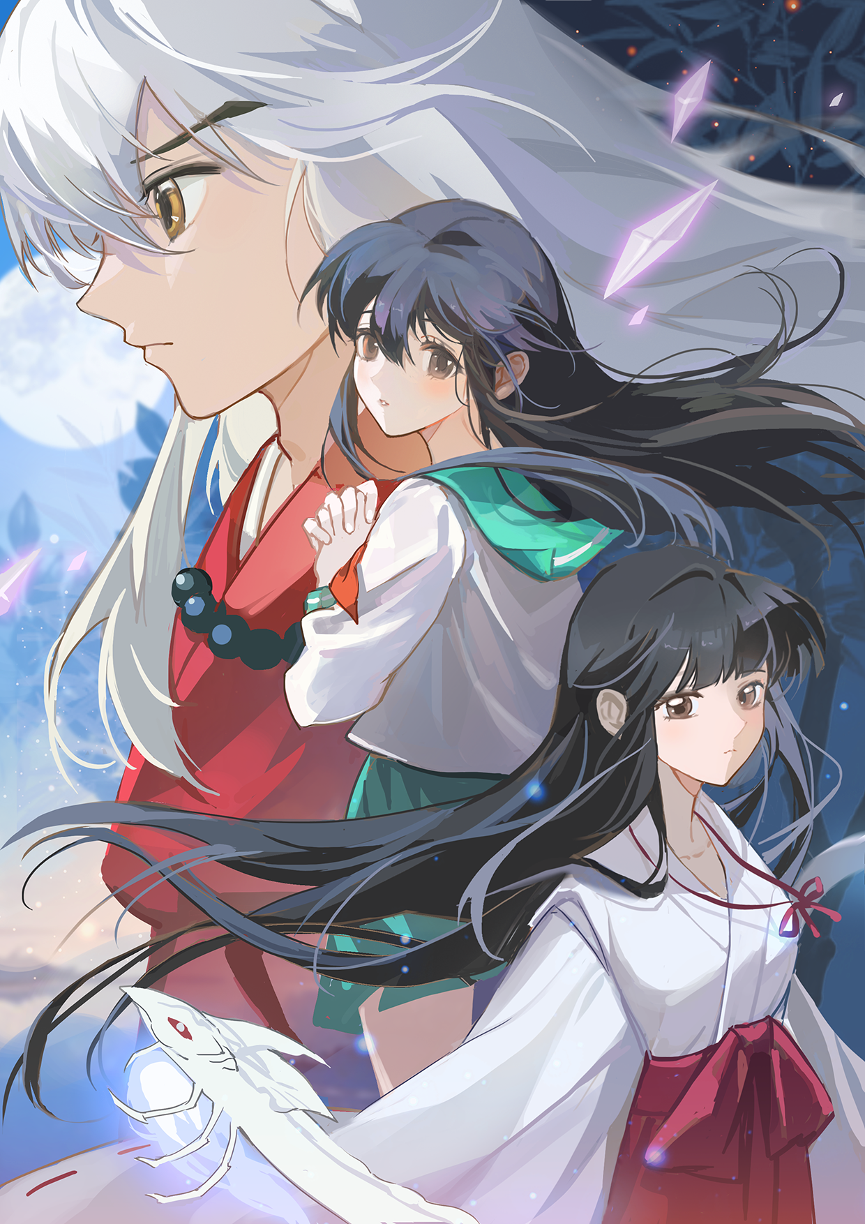 1boy 2girls black_hair brown_eyes green_skirt haitu hakama highres higurashi_kagome inuyasha inuyasha_(character) japanese_clothes kikyou_(inuyasha) long_hair miko multiple_girls red_hakama school_uniform shirt skirt white_hair white_shirt yellow_eyes