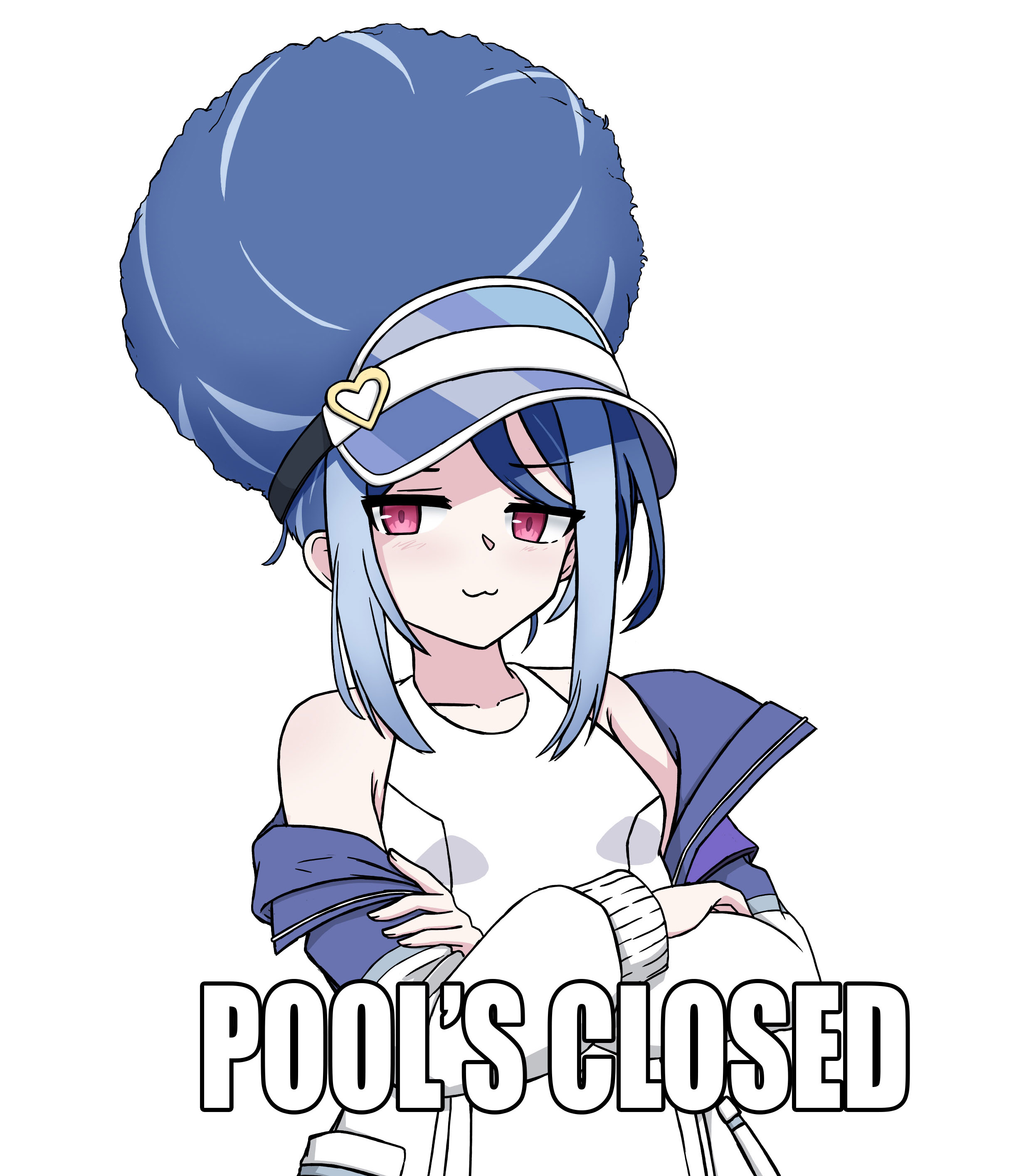 1girl :3 absurdres afro alternate_hairstyle blue_archive blue_hair commentary crossed_arms english_commentary english_text fubuki_(blue_archive) fubuki_(swimsuit)_(blue_archive) habbo_hotel highres impact_(font) jitome looking_at_viewer meme off_shoulder official_alternate_costume one-piece_swimsuit pool's_closed_(meme) sidelocks simple_background smug swimsuit visor_cap white_background white_one-piece_swimsuit xandier59