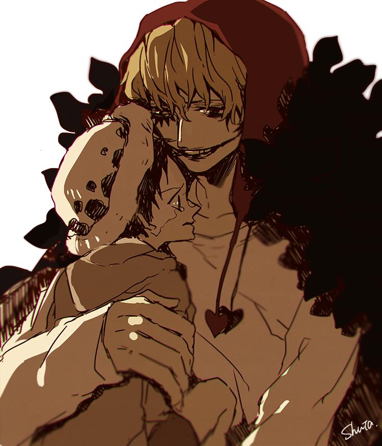 2boys achpyu aged_down black_cape black_hair blonde_hair cape commentary_request donquixote_rocinante facial_mark feather_cape hat hood hug makeup male_focus multiple_boys one_piece shirt short_hair signature simple_background smile trafalgar_law white_background