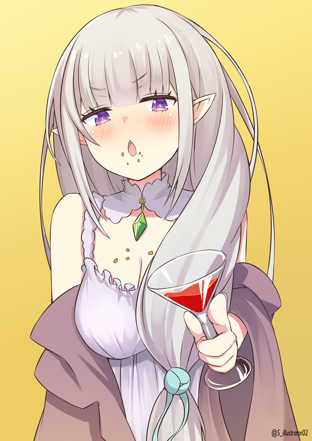 1girl alcohol bare_shoulders blush breasts cleavage commentary_request crumbs cup dress drinking_glass drunk elf emilia_(re:zero) evening_gown gem glass green_gem holding holding_cup long_hair looking_at_viewer off_shoulder open_mouth pointing pointing_at_viewer pointy_ears purple_dress purple_eyes re:zero_kara_hajimeru_isekai_seikatsu red_wine s_(hdru2332) solo upper_body white_hair wine wine_glass