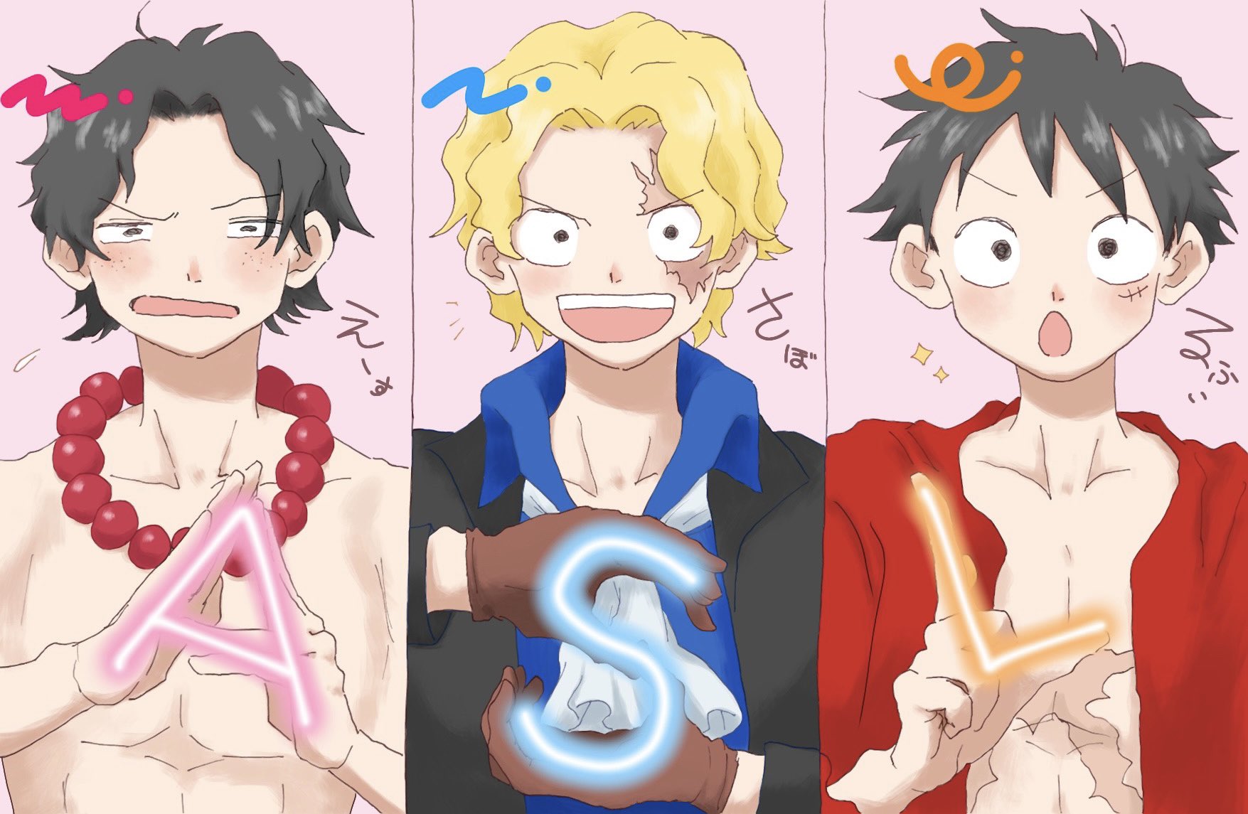 0h_my_god 3boys ascot black_coat blonde_hair blue_shirt brown_gloves coat collared_shirt commentary flying_sweatdrops freckles gloves highres jewelry looking_at_viewer male_focus monkey_d._luffy multiple_boys necklace missing_headwear one_piece open_mouth pearl_necklace pink_background portgas_d._ace red_shirt sabo_(one_piece) scar scar_on_chest scar_on_face shirt simple_background smile sparkle topless_male upper_body white_ascot
