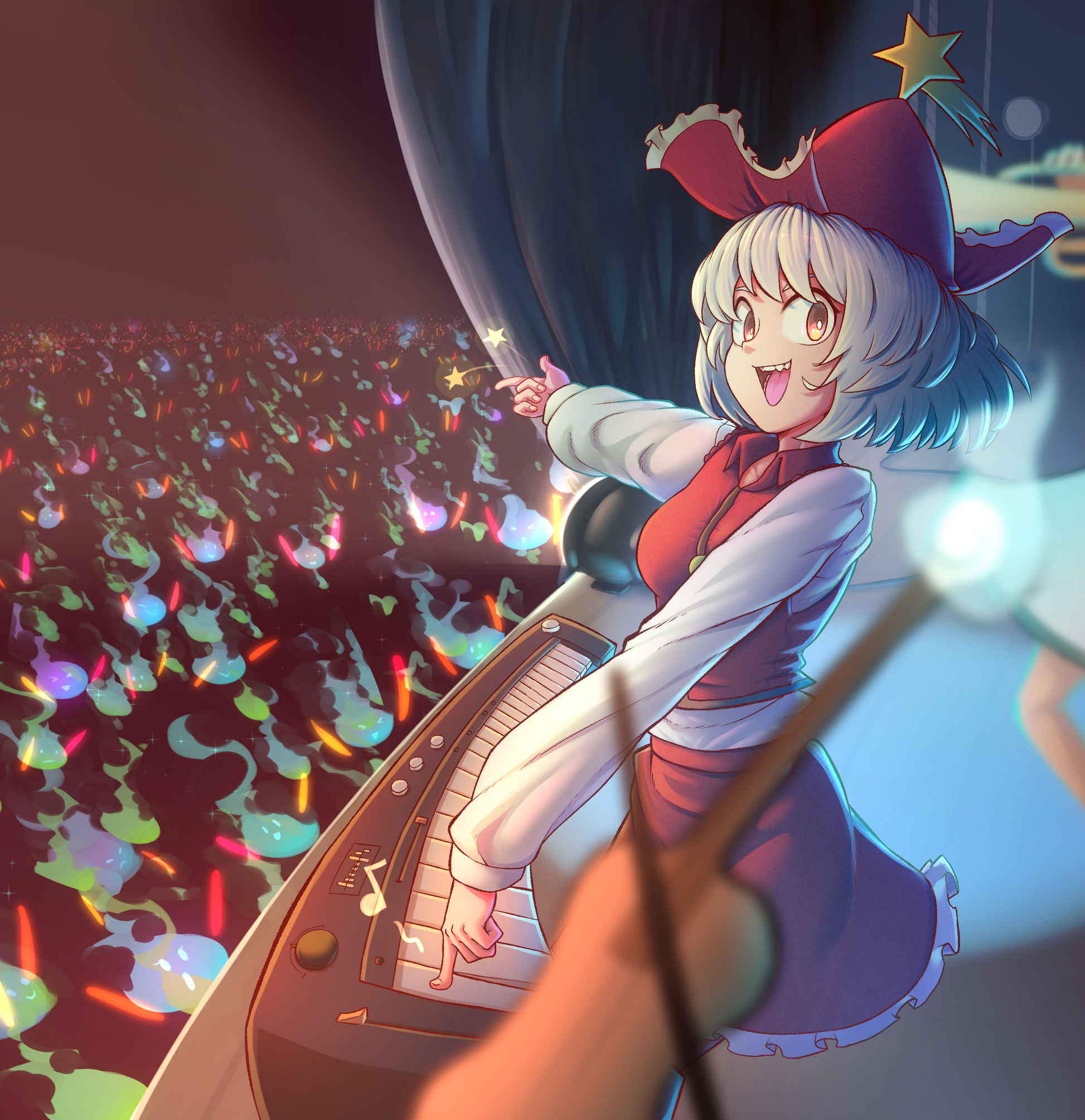 1girl breasts brown_eyes collared_vest floating floating_object frilled_skirt frills grey_hair hat highres hitodama instrument keyboard_(instrument) long_sleeves looking_at_viewer lyrica_prismriver medium_breasts music playing_instrument pointing pointy_hat pov puffy_sleeves red_hat red_skirt red_vest revenge_(vengerezn) shirt shooting_star_hat_ornament short_hair skirt skirt_set stage standing teeth touhou upper_body upper_teeth_only vest violin white_shirt
