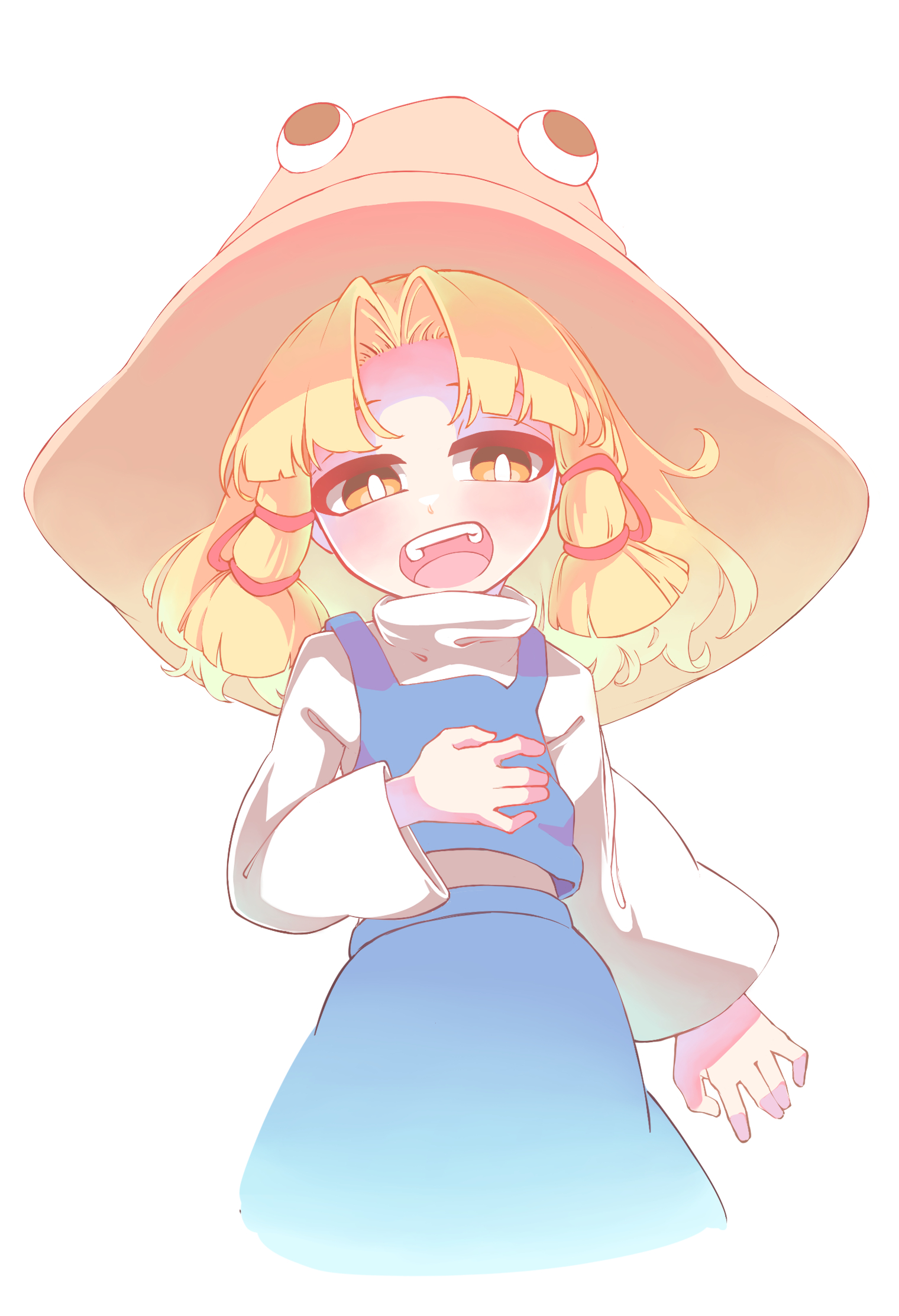 1girl blonde_hair blue_skirt blue_vest blush bright_pupils brown_hat cowboy_shot hair_ribbon hand_on_own_stomach hat highres looking_at_viewer moriya_suwako open_mouth oyatu_potage ribbon shirt sidelocks skirt teeth touhou turtleneck vest white_background white_pupils white_shirt wide_sleeves yellow_eyes
