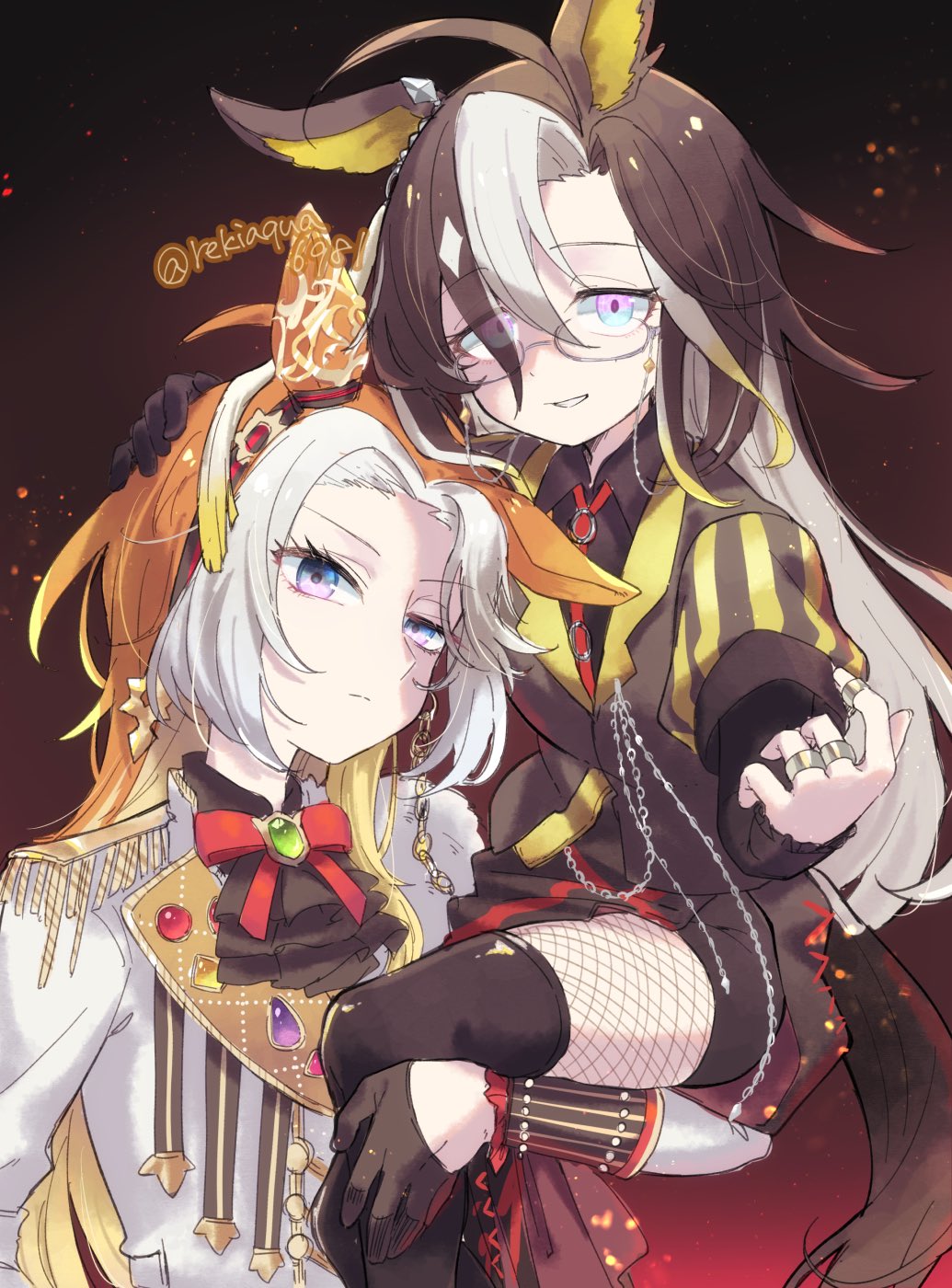 2girls ahoge animal_ears black_gloves black_thighhighs blonde_hair blue_eyes bow bowtie brown_hair carrying commentary_request dream_journey_(umamusume) ear_covers ear_ornament epaulettes eyes_visible_through_hair eyewear_strap fishnet_fabric fur_trim gem glasses gloves gold_trim gradient_eyes gradient_hair green_gem hair_intakes hair_over_one_eye half_gloves hand_on_another's_head head_tilt highres horse_ears horse_girl horse_tail jewelry light_brown_hair long_hair long_sleeves multicolored_eyes multicolored_hair multiple_girls multiple_rings orange_gem orange_hair orfevre_(control)_(umamusume) orfevre_(umamusume) purple_eyes purple_gem red_bow red_bowtie red_gem reki_(arequa) ring shoulder_carry siblings silver_chain single_ear_cover single_epaulette single_sidelock sisters smirk tail thighhighs twitter_username two-tone_eyes umamusume