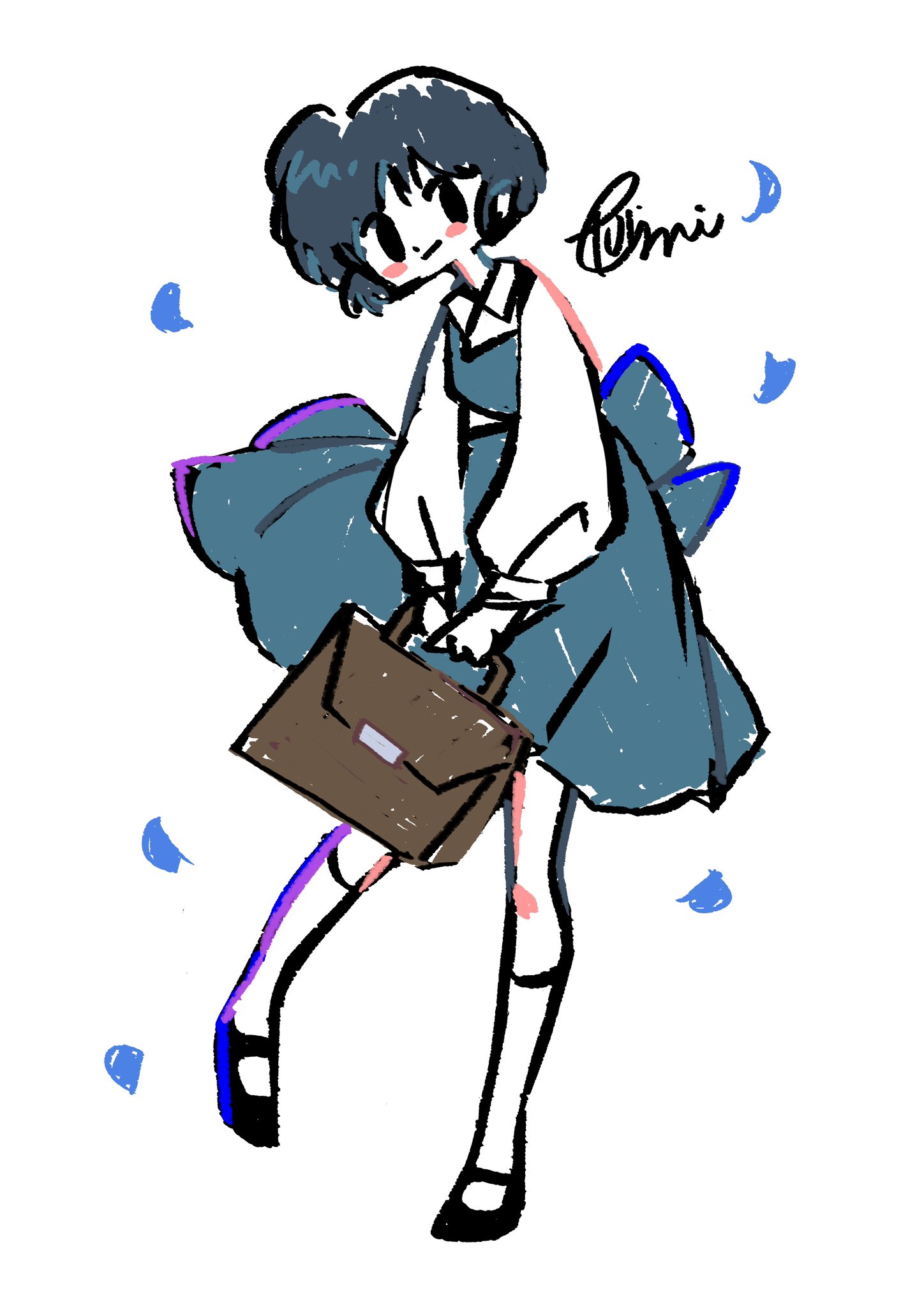 1girl back_bow bag blue_dress blue_hair blush_stickers bow brown_bag dress falling_petals full_body fuziemi highres holding holding_bag kneehighs petals pinafore_dress ranma_1/2 shirt short_hair signature simple_background sleeveless sleeveless_dress socks solo tendou_akane white_shirt white_socks
