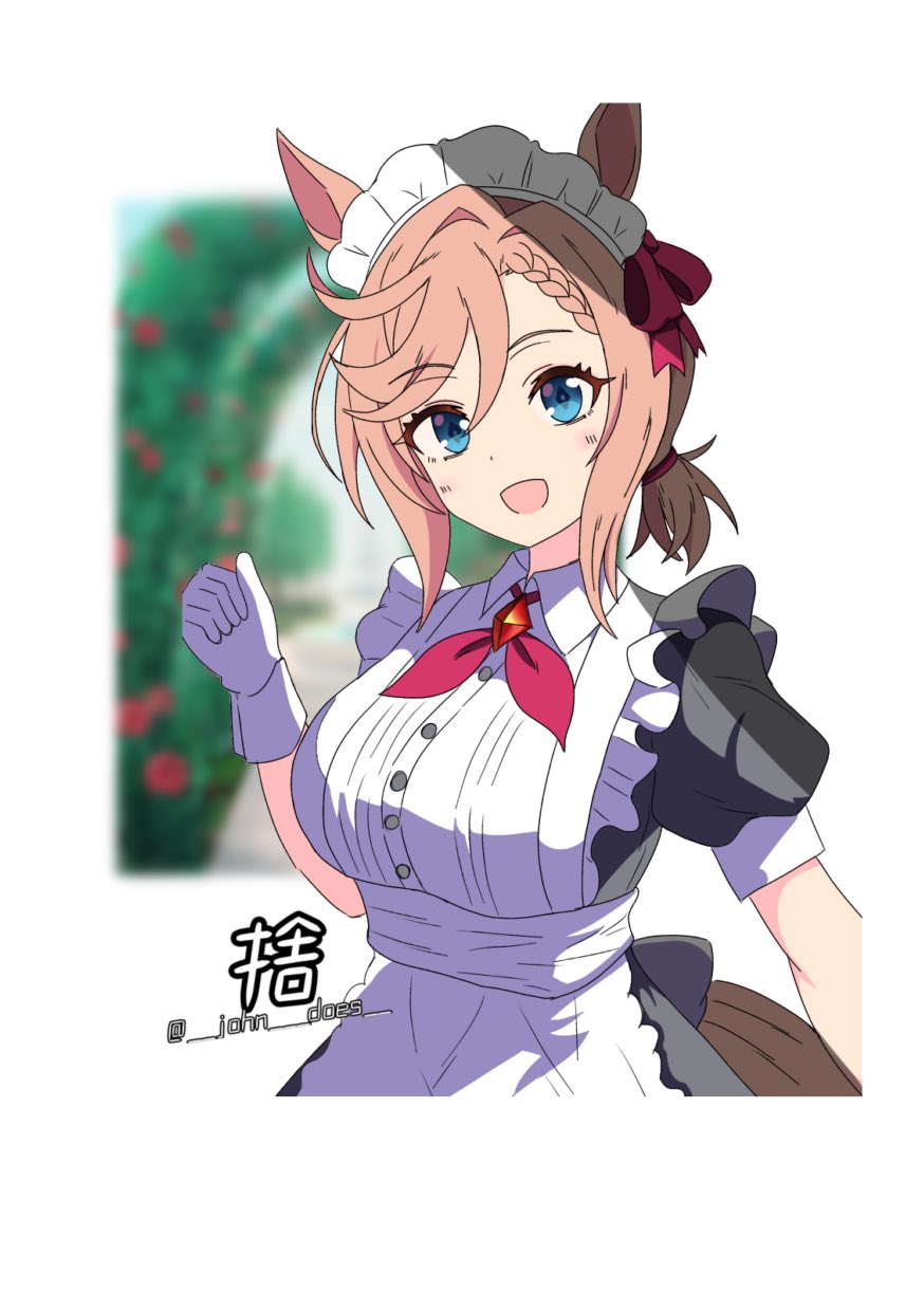 1girl alternate_costume animal_ears blue_eyes blurry blurry_background blush breasts commentary_request enmaided gloves hair_ornament highres horse_girl john_does light_brown_hair maid maid_headdress medium_breasts medium_hair open_mouth ribbon short_twintails solo translation_request twintails twitter_username umamusume venus_paques_(umamusume)