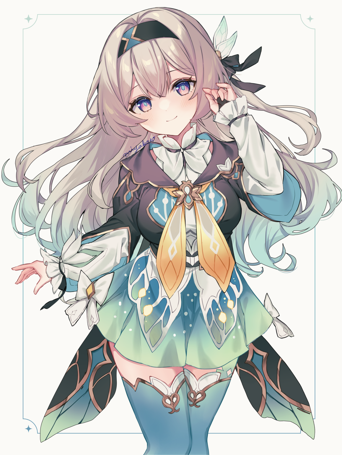 1girl aqua_hair aqua_skirt aqua_thighhighs black_bridal_gauntlets black_hairband black_jacket bridal_gauntlets closed_mouth cropped_jacket firefly_(honkai:_star_rail) gradient_hair grey_hair hair_between_eyes hair_ornament hairband highres honkai:_star_rail honkai_(series) jacket long_hair long_sleeves looking_at_viewer miyakoto multicolored_eyes multicolored_hair shirt single_bridal_gauntlet skirt solo standing thighhighs white_shirt
