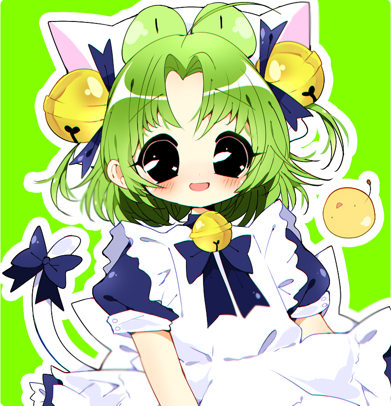 1girl 2000s_(style) animal_hat apron bell black_eyes blush bow cat_girl cat_hat cat_tail dejiko di_gi_charat dress eyelashes gema green_background green_hair hat jingle_bell looking_at_viewer powderpuff short_hair tail tail_bow tail_ornament