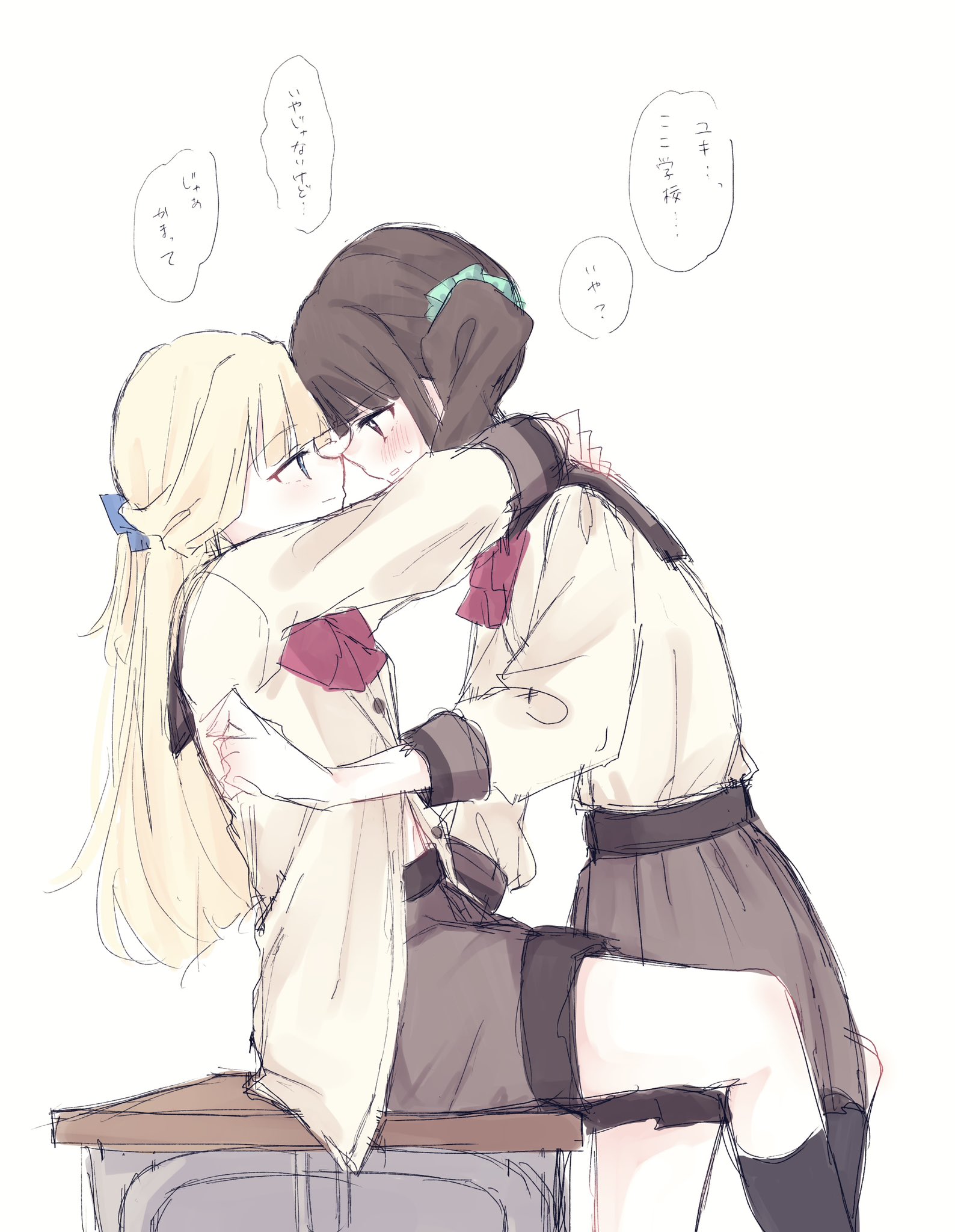 2girls between_legs black_socks blonde_hair blue_eyes blue_ribbon blush bow bowtie brown_hair brown_skirt closed_mouth eye_contact forehead-to-forehead hair_ribbon heads_together highres kneehighs leg_lock long_hair long_sleeves looking_at_another multiple_girls nekoyashiki_mayu nekoyashiki_yuki noses_touching parted_lips precure red_bow red_bowtie red_eyes ribbon rita_(myyk_rrnyam) shirt side_ponytail simple_background sitting skirt socks speech_bubble standing sweatdrop translation_request white_background wonderful_precure! yellow_shirt yuri