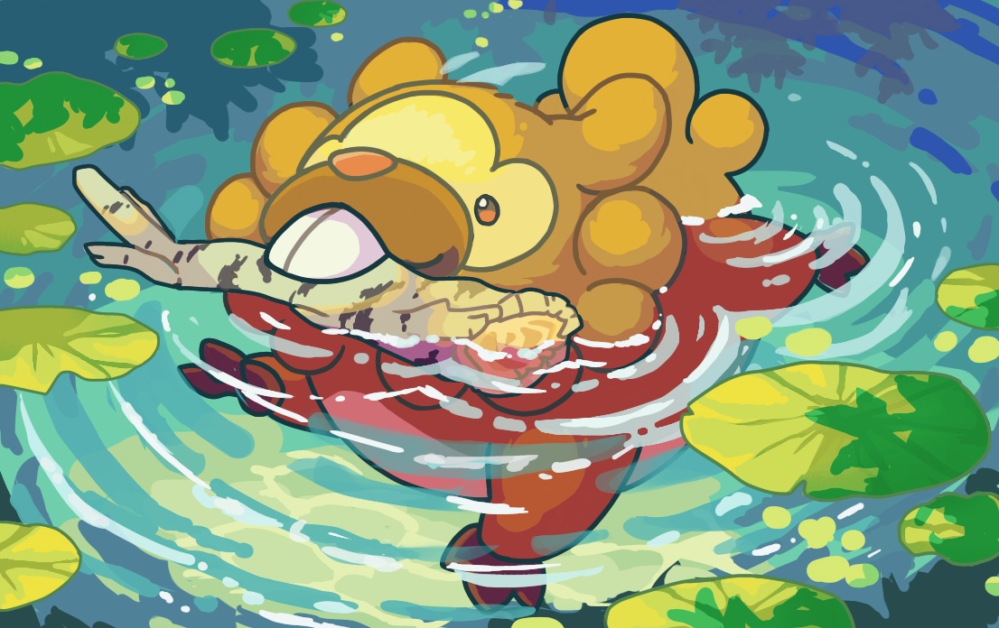 afloat bidoof brown_eyes commentary_request day doneko_(dneko0123) gen_4_pokemon lily_pad mouth_hold nintendo no_humans outdoors pokemon pokemon_(creature) ripples solo stick swimming water