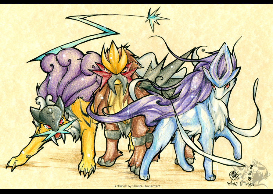 claws entei gen_2_pokemon legendary_pokemon looking_at_viewer nintendo no_humans open_mouth pokemon pokemon_(creature) purple_hair raikou red_eyes shivita standing suicune traditional_media white_hair yellow_eyes