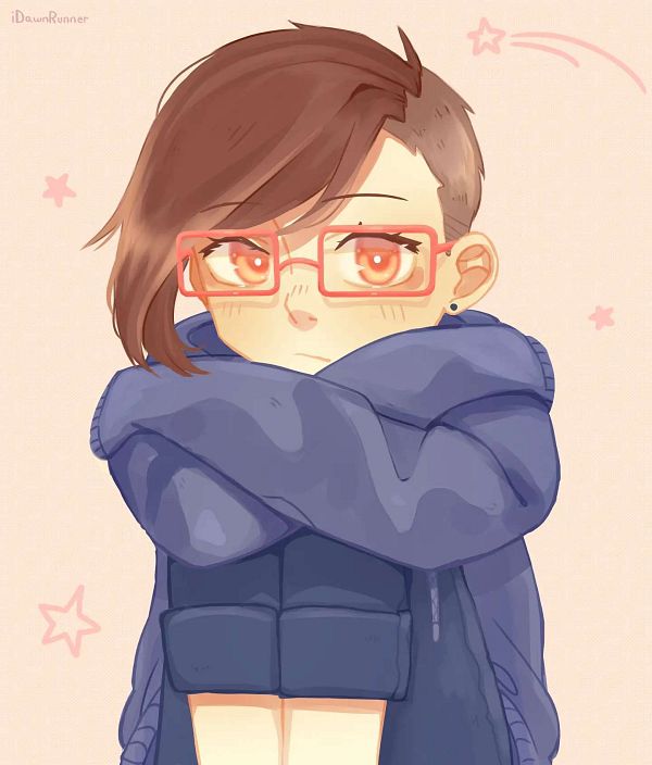 1girl blue_hoodie blue_scarf blue_sweater brown_hair ear_piercing eyelashes glasses hood hoodie idawnrunner kim_(omori) looking_at_viewer omori orange_eyes pants piercing portrait rectangular_eyewear red-framed_eyewear scarf shirt shooting_star short_hair solo star_(symbol) sweater third-party_source undercut