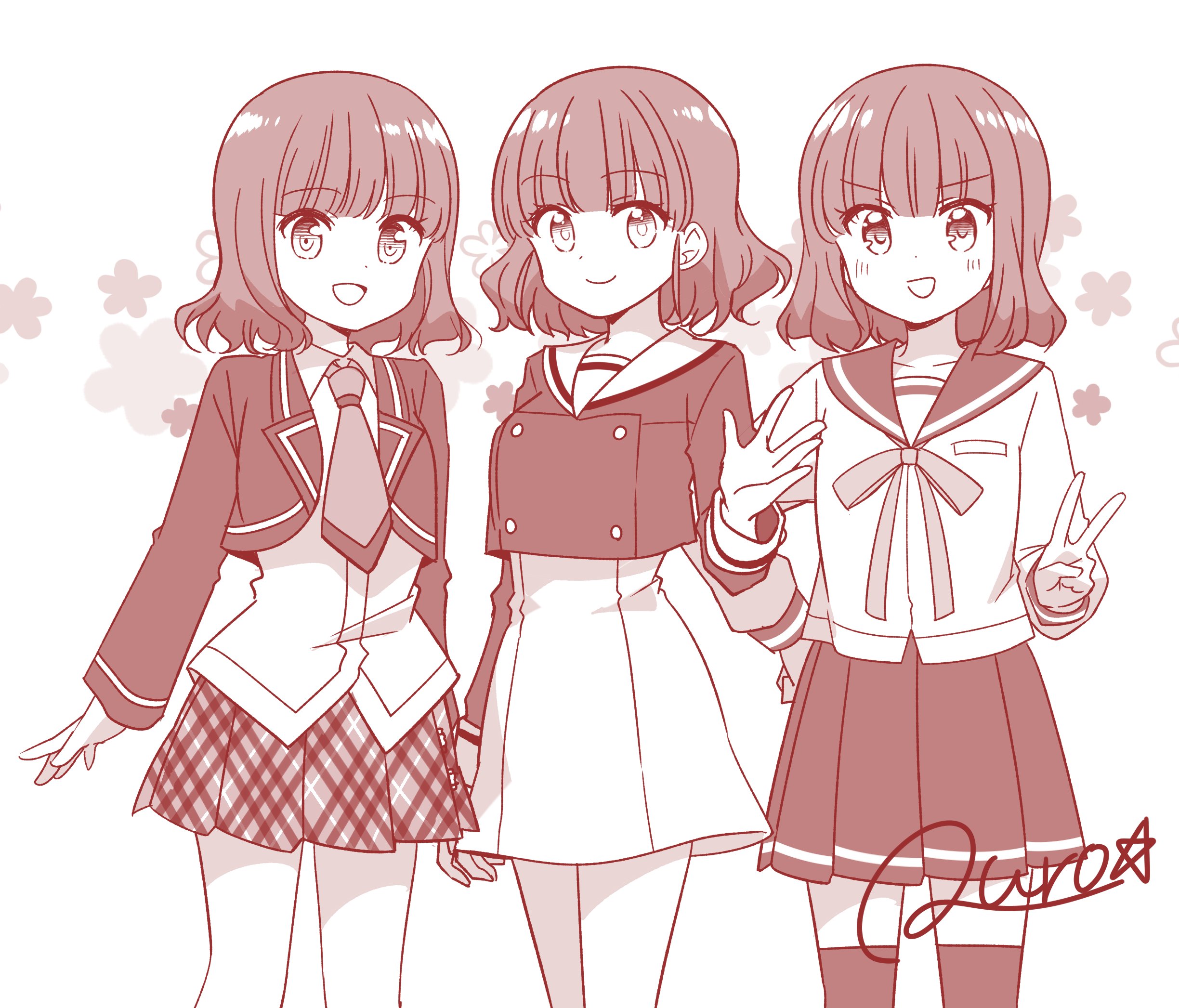 3girls anima_yell! anne_happy artist_name black_thighhighs blush closed_mouth collarbone crossover dot_nose hagyuu_hibiki highres koisuru_asteroid long_sleeves looking_at_viewer medium_hair multiple_girls open_mouth quro_(black_river) sailor_collar sakurai_mikage school_uniform serafuku smile standing thighhighs ushiku_kana v