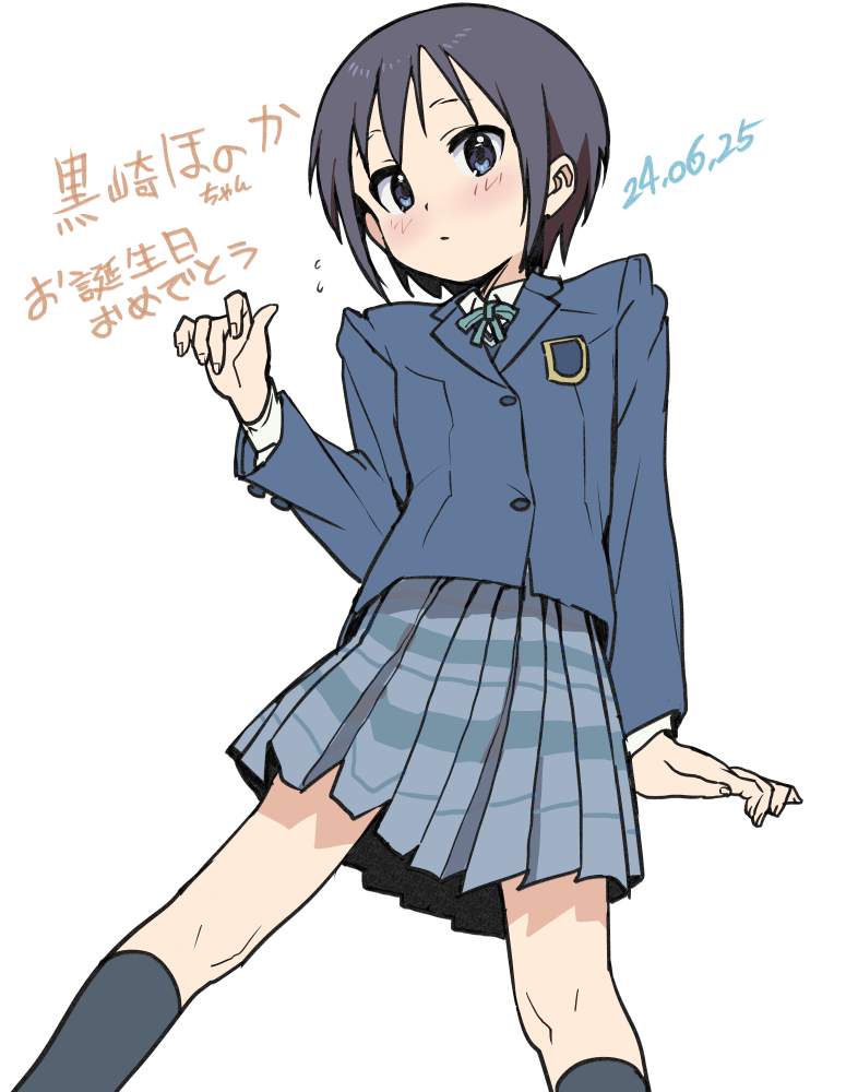 1girl 2024 birthday blue_eyes blue_hair blush closed_mouth dated dot_nose female_focus japanese_text kurosaki_honoka long_sleeves looking_at_viewer medium_hair school_uniform socks solo translation_request yama_no_susume yamaaohina