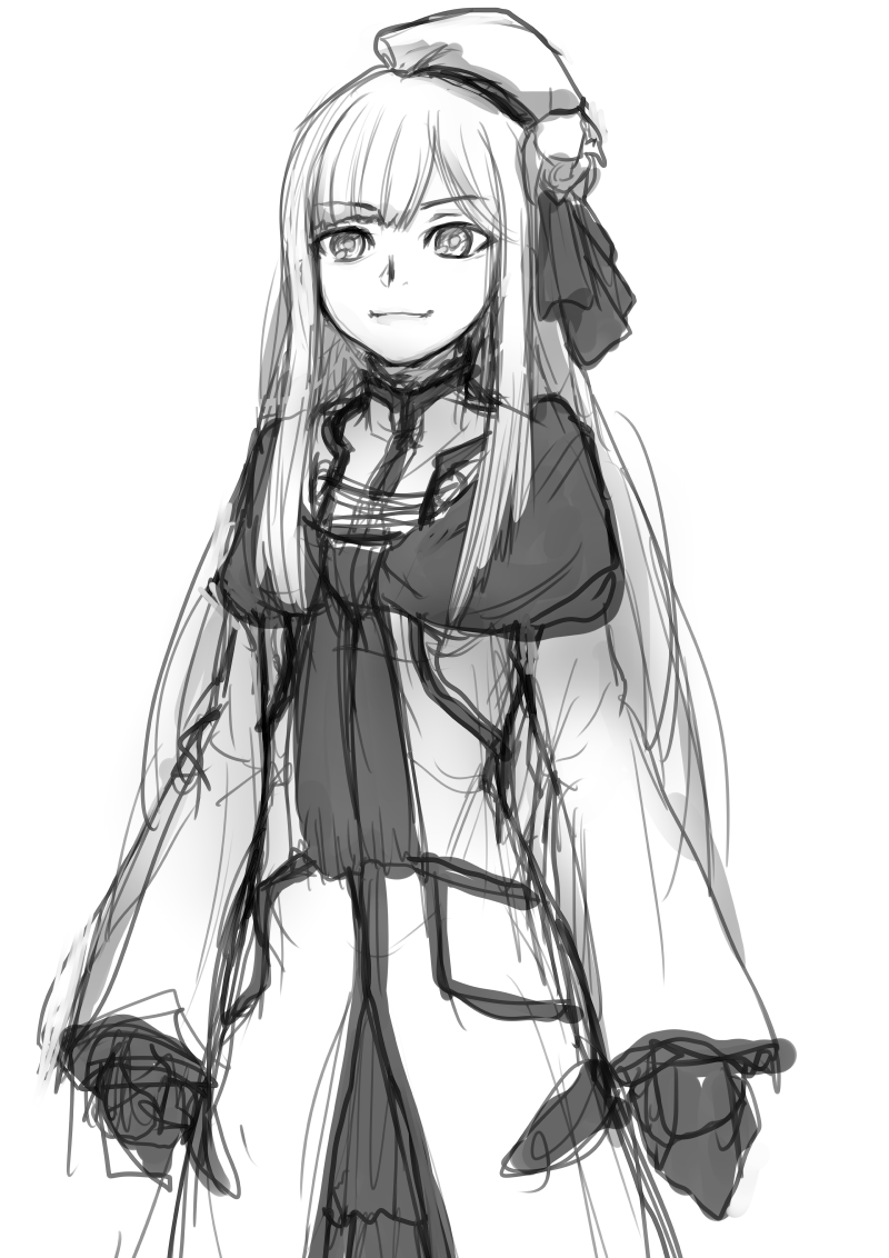 1girl capelet closed_mouth cowboy_shot fate/grand_order fate_(series) flower greyscale hair_flower hair_ornament hat jacket looking_at_viewer monochrome purutoppu_(toranohige) reines_el-melloi_archisorte sketch smile solo