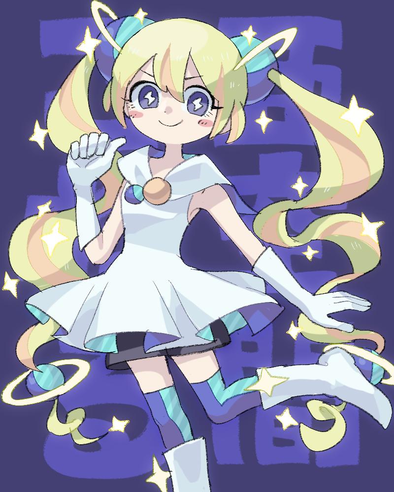 1girl akuukan_coneru blonde_hair blue_eyes blue_thighhighs boots character_name commentary_request coneru_-dimension_girl- cowboy_shot dress gloves hair_ornament hand_up lightning_bolt-shaped_pupils long_hair looking_at_viewer mebuita planet_hair_ornament shorts_under_dress sleeveless sleeveless_dress smile solo sparkle standing standing_on_one_leg symbol-shaped_pupils thighhighs translation_request twintails white_boots white_dress white_gloves