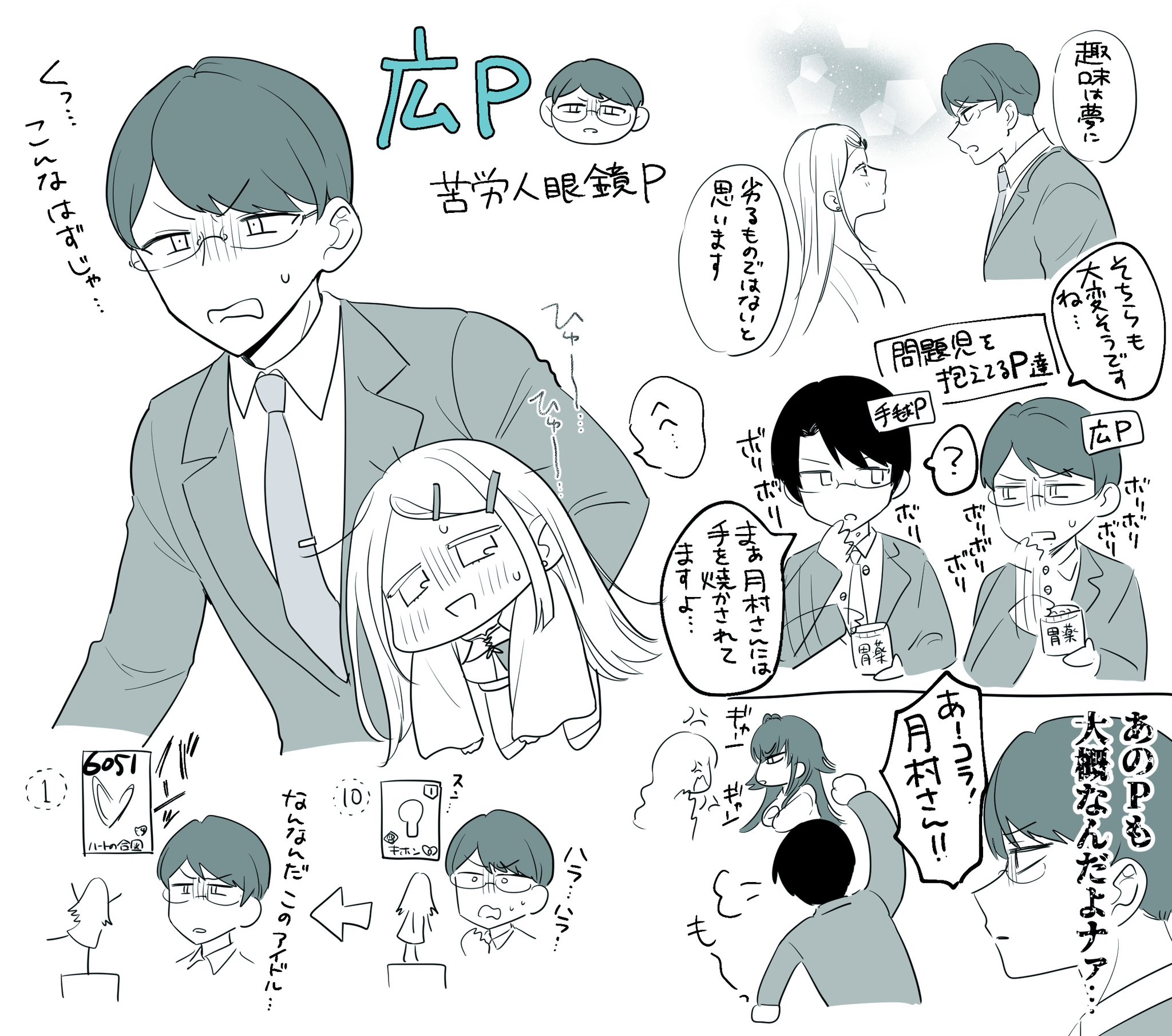 2boys 2girls ? carrying carrying_person carrying_under_arm commentary_request cropped_torso eating formal_clothes fujisaki_yuu_(nkrm) gakuen_idolmaster glasses highres idolmaster monochrome multiple_boys multiple_girls producer_(idolmaster) puff_of_air shinosawa_hiro speech_bubble spoken_question_mark sweatdrop translation_request tsukimura_temari upper_body