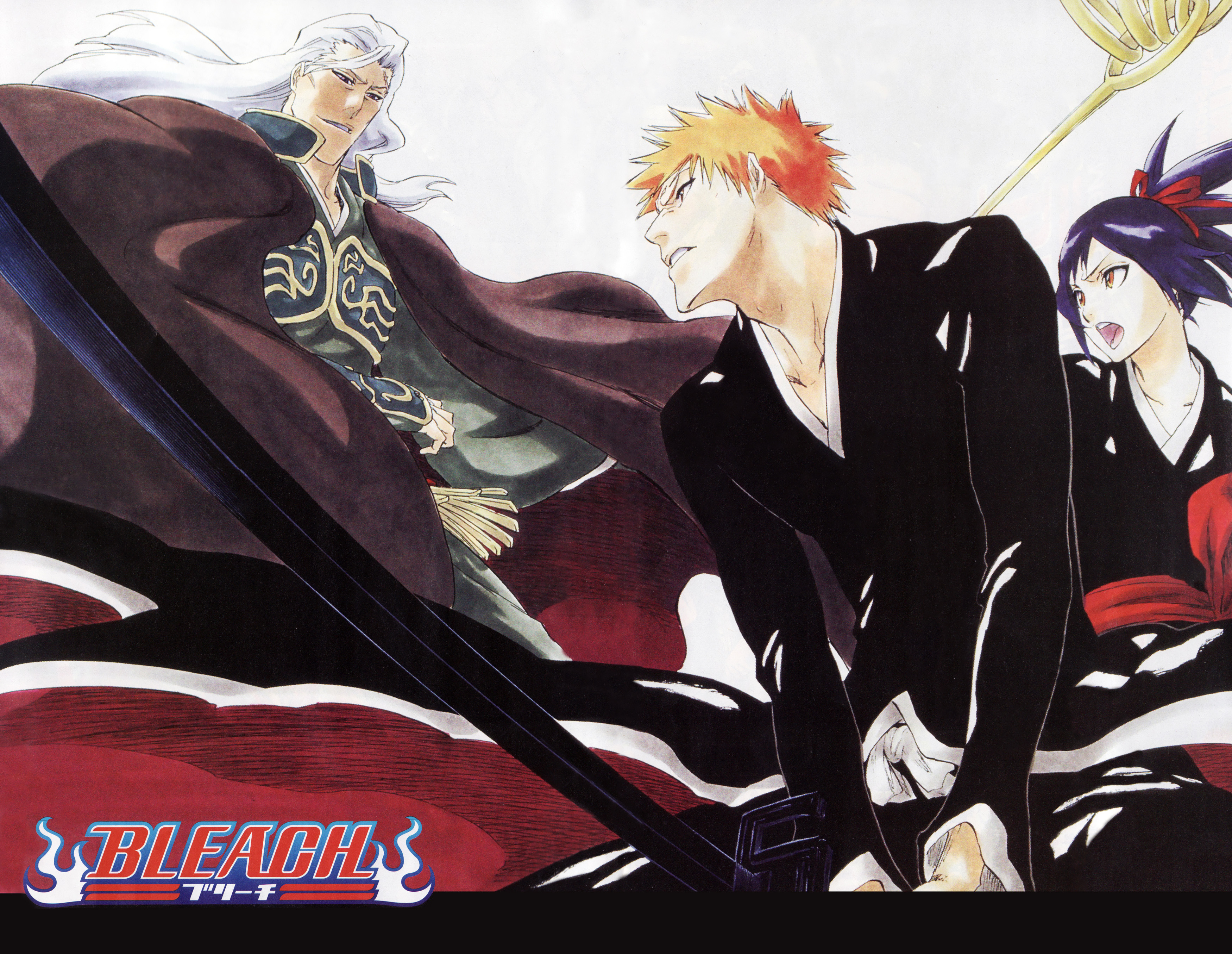 00s 1girl 2006 2boys absurdres angry bankai bleach bleach:_memories_of_nobody bow cape cleaned evil_smile fighting_stance floating_hair ganryuu hair_bow hair_ribbon hair_up high_ponytail highres holding holding_sword holding_weapon japanese_clothes katana kimono kubo_tite kurosaki_ichigo long_hair manly movie_poster_(medium) multiple_boys obi official_art open_mouth orange_hair ponytail poster_(medium) purple_hair ribbon sash scan senna_(bleach) short_hair smile spiked_hair staff sword weapon white_background white_hair yellow_eyes
