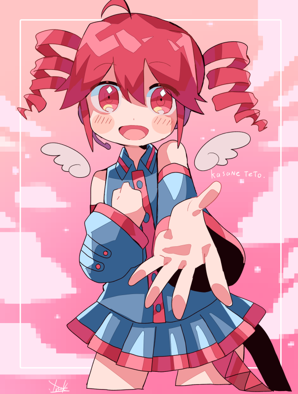 1girl blush character_name collared_shirt cropped_legs detached_sleeves drill_hair hand_on_own_chest headset kasane_teto kasane_teto_(utau) long_sleeves open_mouth outstretched_arm pink_eyes pink_hair pleated_skirt reaching reaching_towards_viewer shirt skirt sleeveless sleeveless_shirt smile solo twin_drills utau wings yuusuke-kun