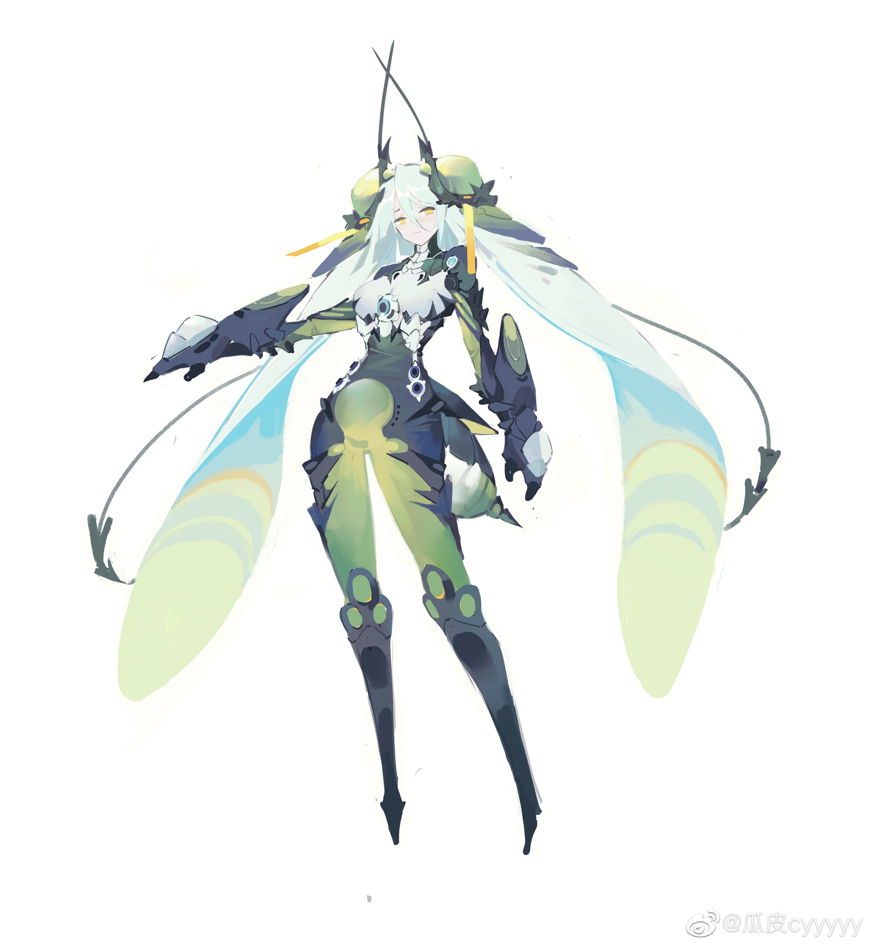 1girl abdomen_tail absurdres aqua_hair armor arthropod_girl artist_name black_bodysuit black_footwear bodysuit breastplate breasts chinese_commentary commentary_request cyyyyy floating frown full_body gauntlets green_pants hair_ornament highres long_hair long_sleeves looking_at_viewer medium_breasts monster_girl multicolored_hair no_pupils original pale_skin pants science_fiction simple_background solo stinger white_background yellow_eyes