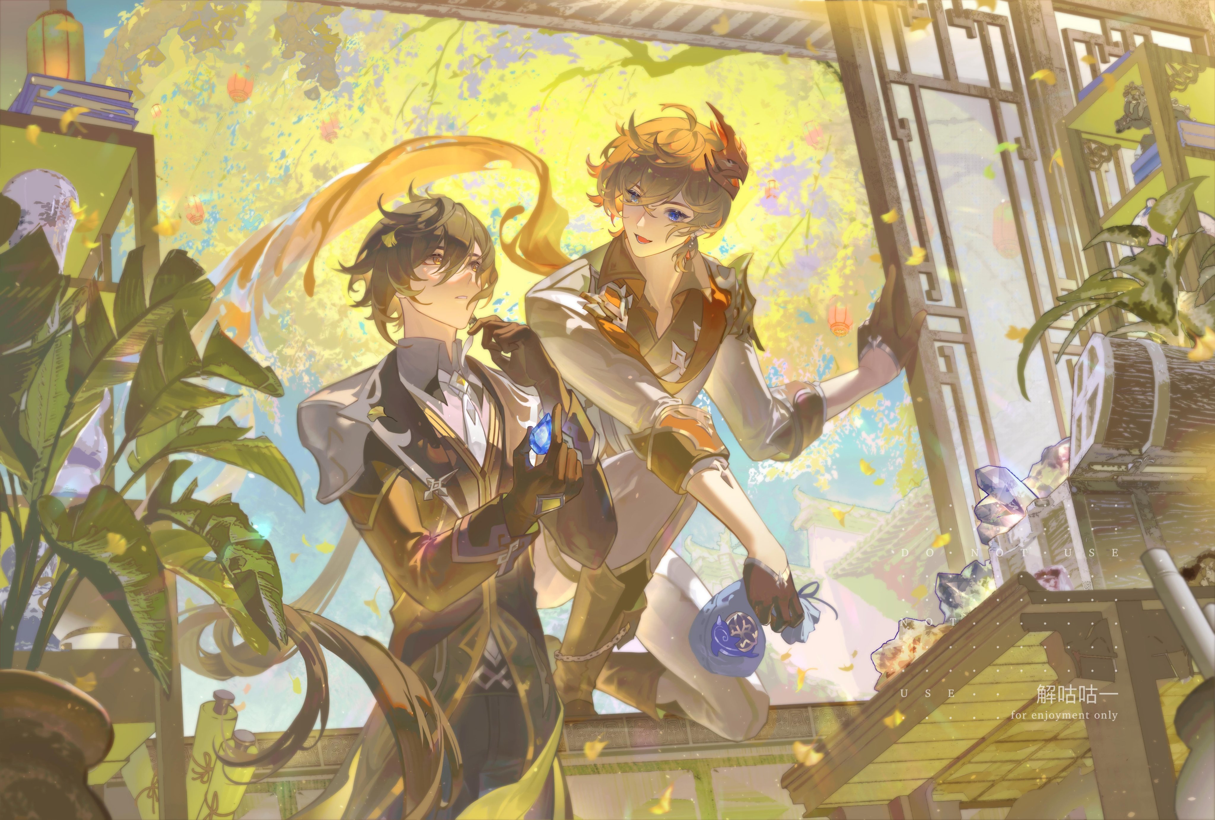 2boys absurdres architecture bag black_gloves blue_eyes book brown_hair collared_shirt commentary_request crossed_bangs crystal_earrings earrings east_asian_architecture eyeliner eyeshadow formal_clothes gem genshin_impact gloves gradient_hair grey_pants hair_between_eyes highres holding holding_bag holding_gem jewelry lantern leaf long_hair looking_at_another lu_bai_(lugugu99) makeup mask mask_on_head multicolored_hair multiple_boys necktie open_window orange_hair pants plant potted_plant red_eyeshadow red_mask red_scarf scarf scroll shirt short_hair sleeves_rolled_up squatting standing suit tartaglia_(genshin_impact) tassel tassel_earrings treasure treasure_chest tree very_long_hair white_necktie window yellow_eyes zhongli_(genshin_impact)