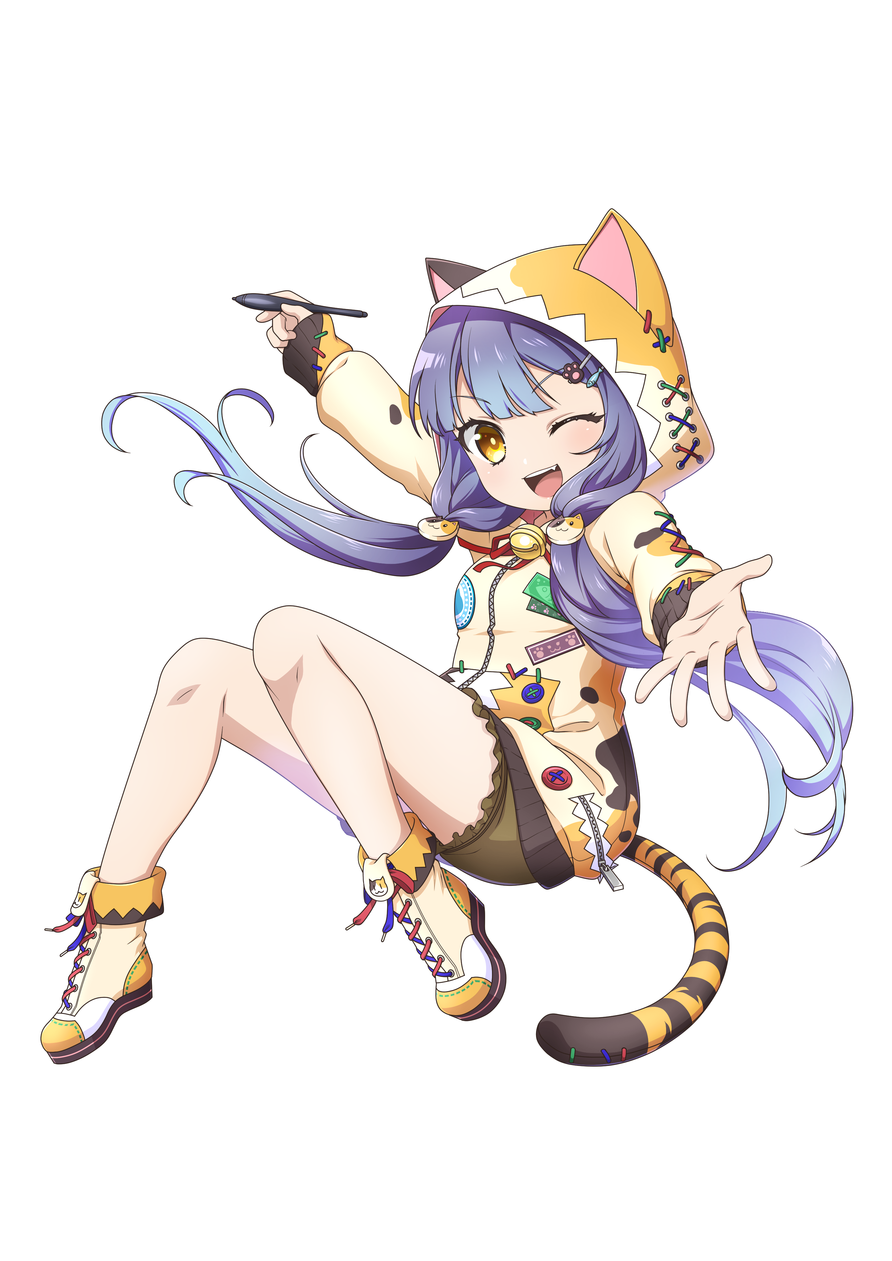 1girl absurdres animal_ear_hood brown_footwear calico_print cat_hair_ornament cat_tail fake_animal_ears full_body hair_ornament hairclip highres holding holding_pen hood hood_up hoodie long_hair looking_at_viewer one_eye_closed orange_eyes original pen purple_hair reaching reaching_towards_viewer simple_background solo sukiyaki_(sukiyaki-jp) tail transparent_background twintails