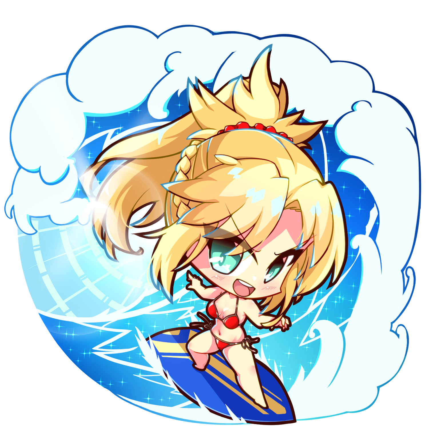 1girl blonde_hair chibi dg11 fate/grand_order fate_(series) green_eyes highres mordred_(fate) mordred_(fate/apocrypha) mordred_(swimsuit_rider)_(fate) open_mouth ponytail solo surfboard surfing swimsuit teeth transparent_background type-moon upper_teeth_only water waves