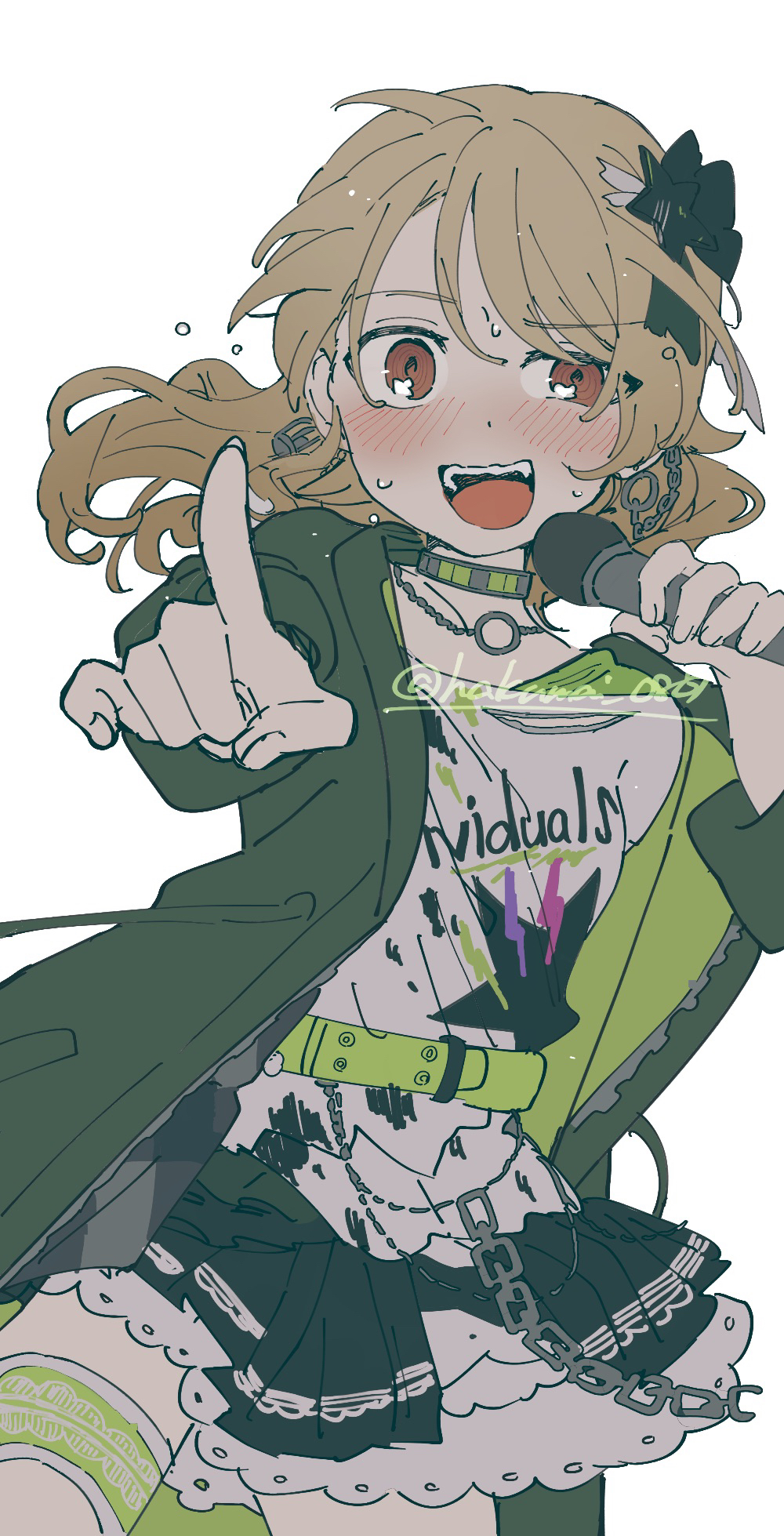 1girl alternate_hairstyle belly_chain belt blush breasts brown_eyes brown_hair chain chain_earrings chain_necklace collarbone cowboy_shot dot_nose floating_hair flying_sweatdrops green_belt green_jacket green_skirt hair_ornament highres holding holding_microphone idolmaster idolmaster_cinderella_girls idolmaster_cinderella_girls_starlight_stage index_finger_raised jacket jewelry long_hair long_sleeves looking_at_viewer microphone miniskirt morikubo_nono necklace open_clothes open_jacket open_mouth raru_buran shirt simple_background skirt small_breasts smile solo standing star_(symbol) star_hair_ornament sweat teeth thigh_strap tongue twitter_username two-tone_choker upper_teeth_only white_background white_shirt