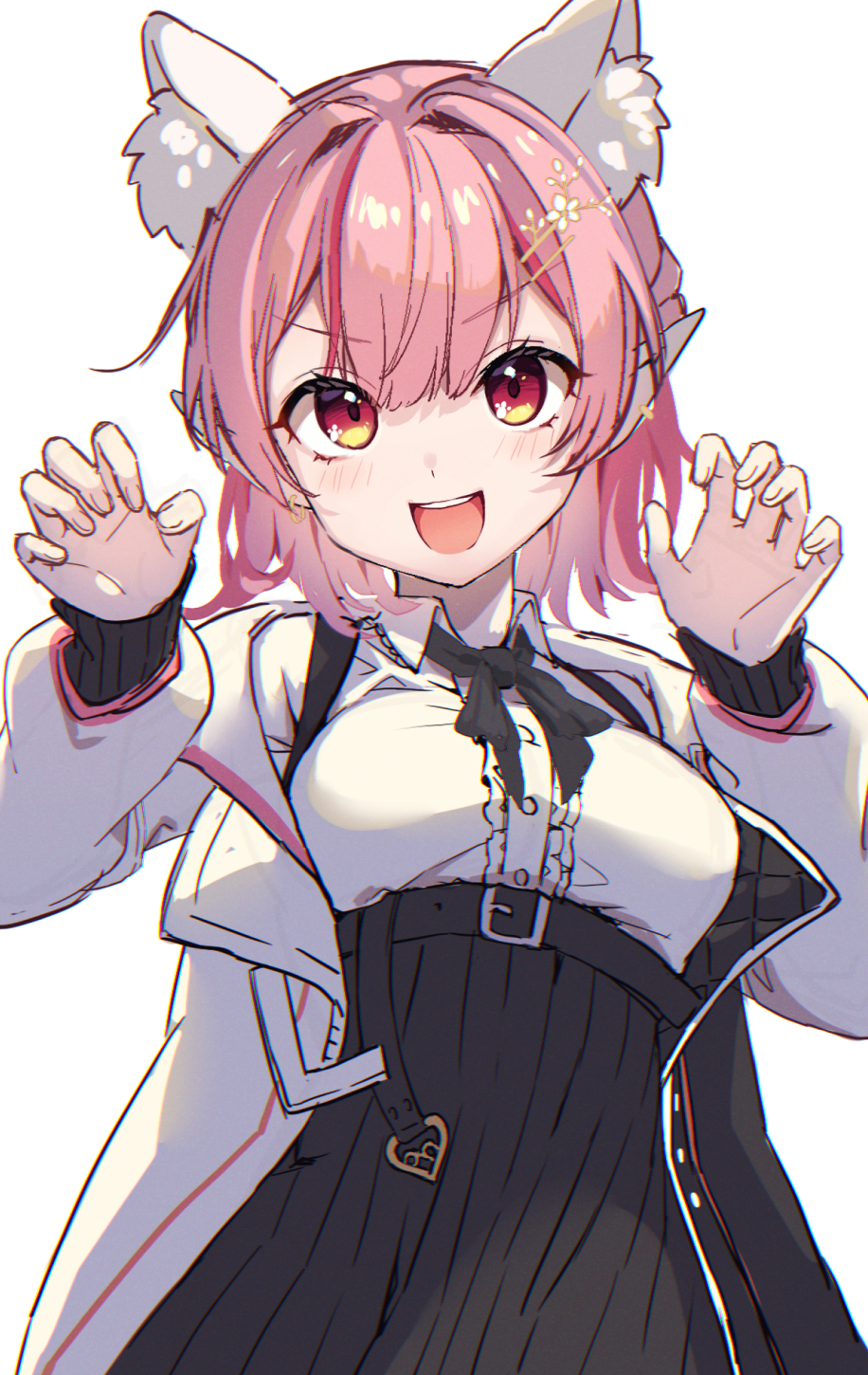 1girl :d animal_ear_fluff animal_ears black_skirt blush breasts center_frills claw_pose collared_shirt commentary_request dress_shirt elf elu_(11th_costume)_(nijisanji) elu_(nijisanji) frills hands_up high-waist_skirt highres jacket kayase long_sleeves looking_at_viewer medium_breasts multicolored_hair nijisanji open_clothes open_jacket open_mouth pink_hair pleated_skirt pointy_ears puffy_long_sleeves puffy_sleeves red_eyes red_hair shirt simple_background skirt smile solo streaked_hair suspender_skirt suspenders teeth upper_teeth_only v-shaped_eyebrows virtual_youtuber white_background white_jacket white_shirt