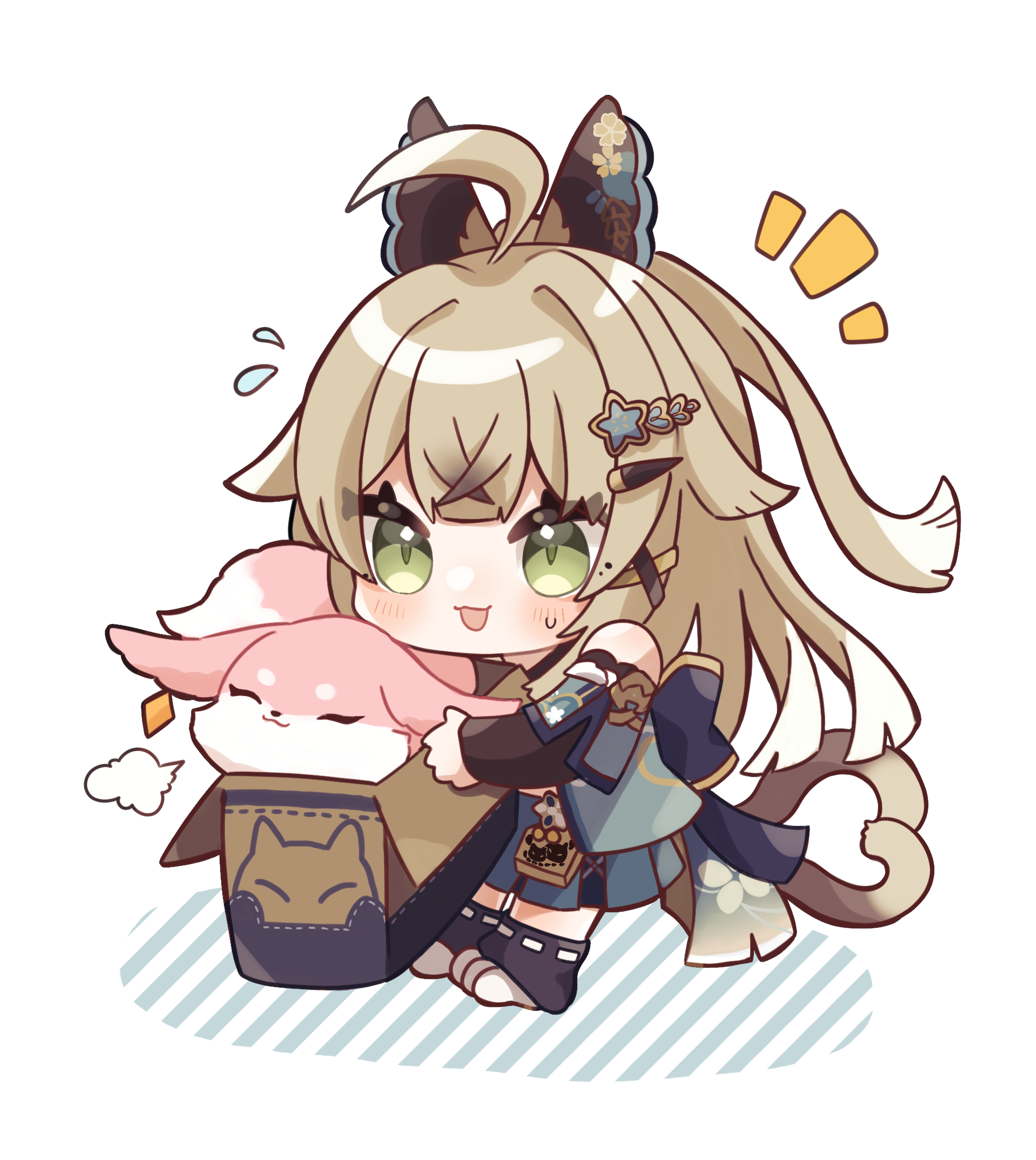 1girl :3 :d ^_^ ahoge animal_ears animal_feet back_bow bare_shoulders black_bow black_gloves black_leg_warmers blue_skirt blue_sleeves blush bow box brown_hair cardboard_box cat_feet cat_girl cat_tail chibi closed_eyes closed_mouth commentary_request detached_sleeves double-parted_bangs earrings elbow_gloves ema eyelashes fingerless_gloves floral_print flying_sweatdrops fox genshin_impact gloves green_eyes hair_between_eyes hair_bow hair_intakes hair_ornament hairclip highres holding holding_box in_box in_container jewelry kirara_(genshin_impact) leg_warmers long_hair looking_at_viewer multiple_tails nanakusa_yomogi nekomata notice_lines open_mouth pleated_skirt puff_of_air short_sleeves sidelocks simple_background skirt smile standing sweatdrop tail two_tails white_background x_hair_ornament yae_miko yae_miko_(fox)