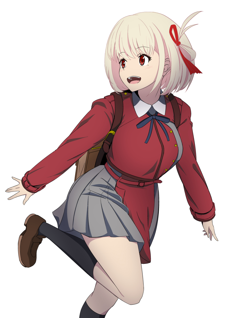 1girl :d backpack bag black_socks blonde_hair blue_ribbon brown_shoes commentary_request dress eyelashes foot_out_of_frame grey_dress hair_ribbon happy kneehighs koganei light_blush loafers long_sleeves looking_to_the_side lycoris_recoil lycoris_uniform neck_ribbon nishikigi_chisato one_side_up open_mouth pleated_dress red_dress red_eyes red_ribbon ribbon shoes short_hair simple_background smile socks solo standing standing_on_one_leg straight_hair teeth two-tone_dress upper_teeth_only white_background