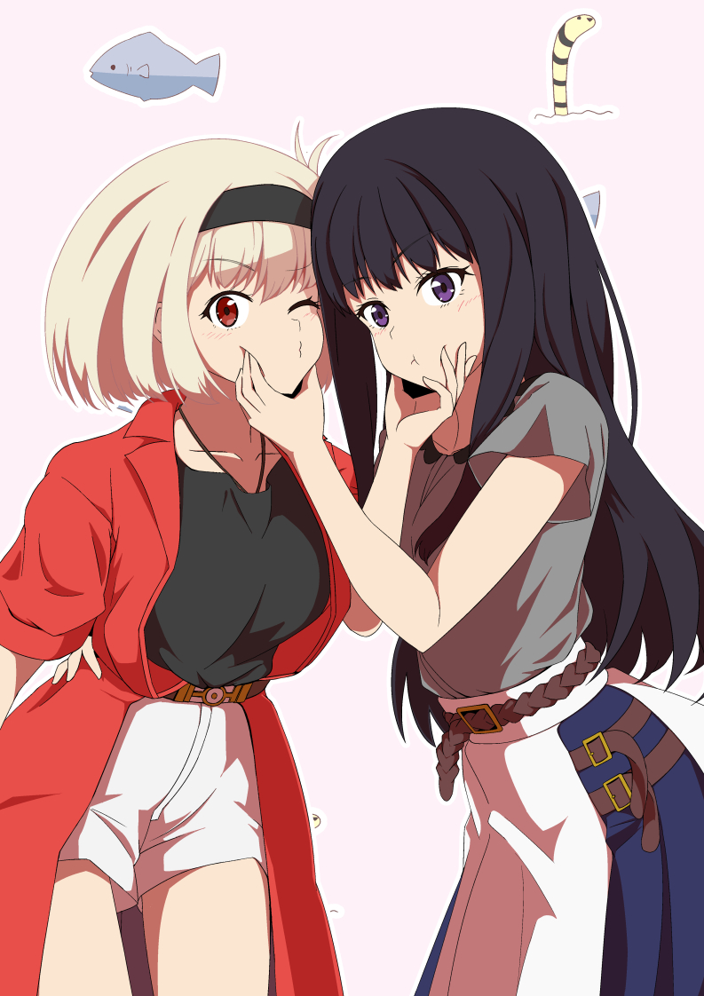 2girls :t black_hair black_hairband black_shirt blonde_hair blue_skirt cheek_squash coat commentary_request cowboy_shot eyelashes fish grey_shirt hair_between_eyes hairband hand_on_another's_cheek hand_on_another's_face hand_on_another's_hip hand_up inoue_takina koganei light_blush long_hair looking_at_viewer lycoris_recoil medium_hair meme multiple_girls nishikigi_chisato o3o one_eye_closed open_clothes open_coat purple_eyes red_coat red_eyes sakana~_(meme) shirt short_sleeves shorts side-by-side simple_background skirt straight_hair tsurime very_long_hair white_background white_shorts