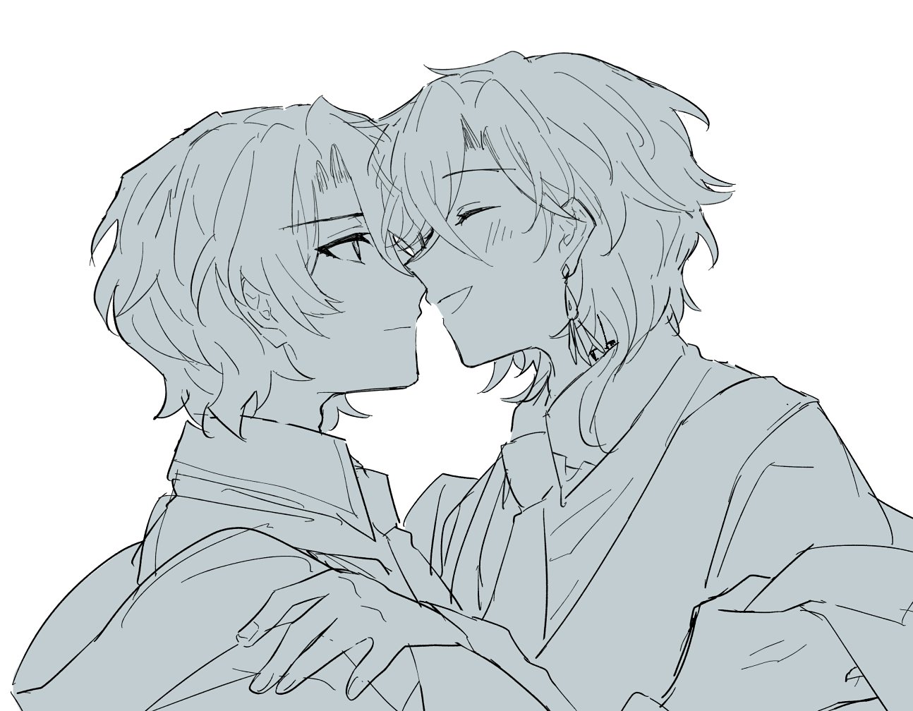 2boys amachi_(yuuin) aventurine_(honkai:_star_rail) closed_eyes collared_shirt dr._ratio_(honkai:_star_rail) earrings greyscale honkai:_star_rail honkai_(series) jewelry male_focus monochrome multiple_boys neck–tattoo necktie shirt short_hair single_sleeve smile white_background yaoi
