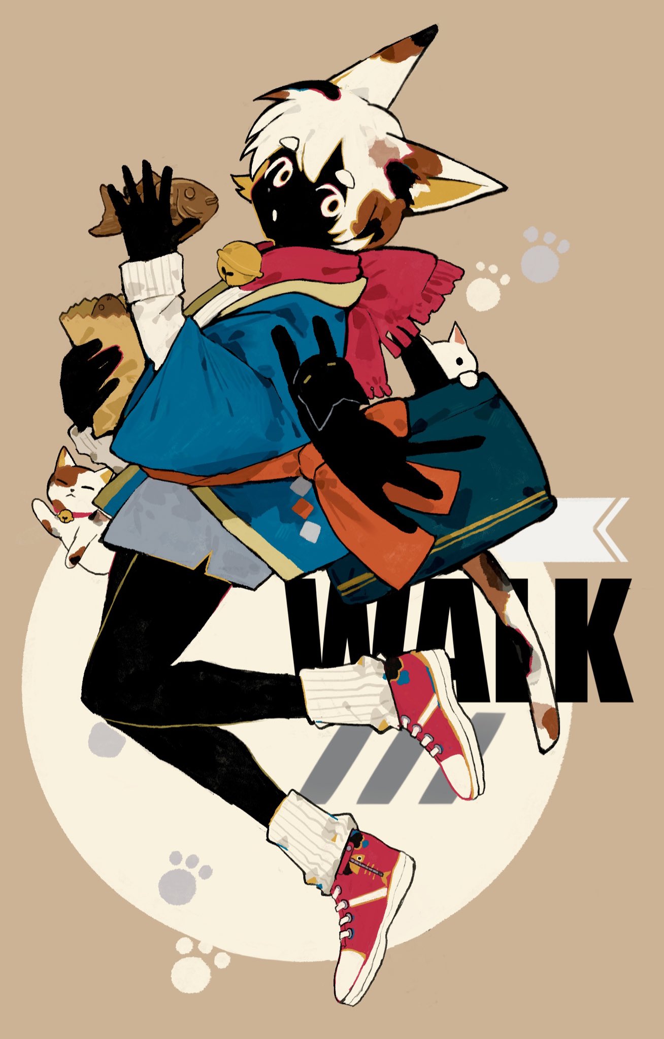1boy animal_ears bag bell black_cat black_skin blue_cardigan brown_background calico_(pattern) calico_cat cardigan cat cat_boy cat_ears cat_tail colored_mouth colored_skin commentary facing_to_the_side food from_side full_body grey_shorts hand_up highres holding holding_bag holding_food jacket kakuremino_(mnt55) knees_together_feet_apart layered_sleeves long_sleeves looking_back loose_socks male_focus multicolored_hair neck_bell no_sclera open_hand original paper_bag parted_lips red_scarf red_shoes scarf shoes short_hair short_over_long_sleeves short_shorts short_sleeves shorts shoulder_bag sneakers socks solo spotted_hair tail taiyaki thick_eyebrows wagashi white_eyes white_hair white_jacket white_socks wide_sleeves
