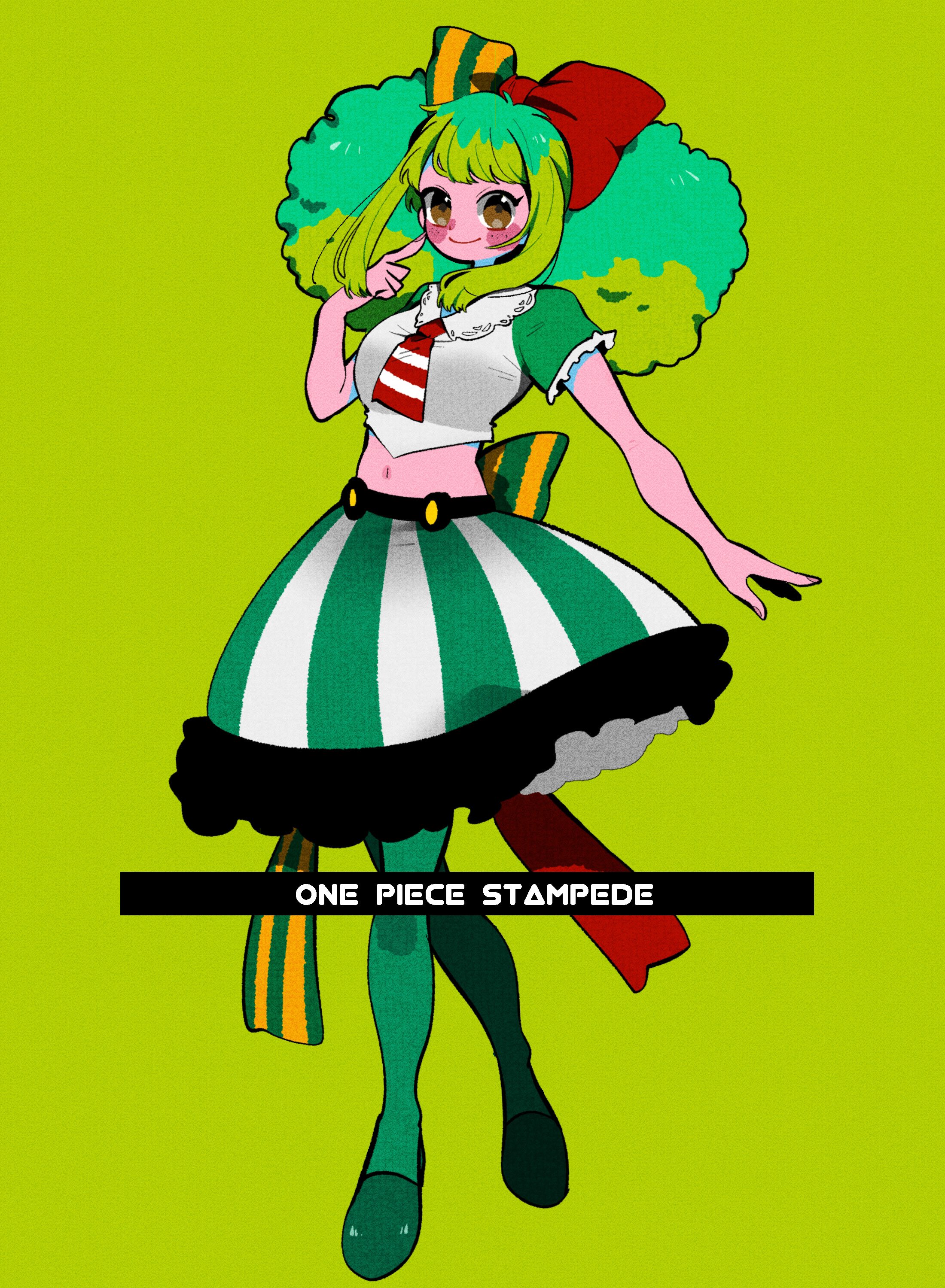 1girl absurdres ann_(one_piece) anna_(aannnaa3) blush_stickers bow brown_eyes closed_mouth commentary_request copyright_name full_body green_background green_hair green_pantyhose hair_bow highres looking_at_viewer navel one_piece one_piece:_stampede pantyhose short_sleeves sidelocks simple_background skirt smile solo striped_clothes striped_skirt twintails vertical-striped_clothes vertical-striped_skirt