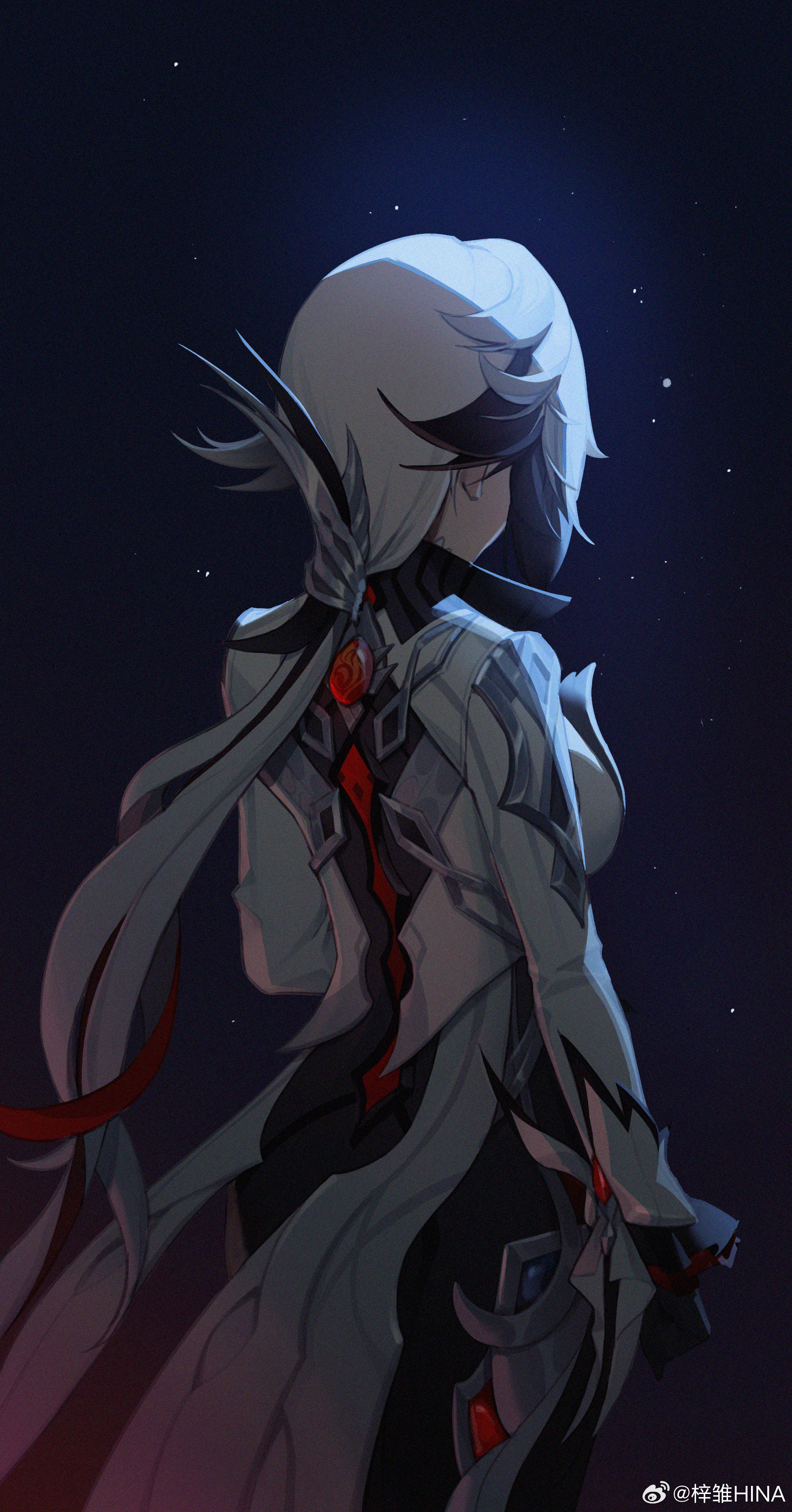 1girl absurdres arlecchino_(genshin_impact) azusa_hina black_background black_gloves black_hair blue_background breasts chinese_commentary clenched_hand commentary cowboy_shot dress from_behind genshin_impact gloves gradient_background highres long_hair long_sleeves medium_breasts multicolored_hair ponytail solo two-tone_hair very_long_hair vision_(genshin_impact) watermark weibo_watermark white_dress white_hair