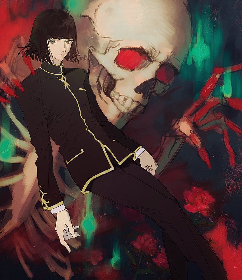 1boy black_hair black_pants blunt_bangs expressionless feet_out_of_frame gakuen_basara gakuran gold_trim green_eyes looking_to_the_side male_focus multicolored_background pants school_uniform sengoku_basara shibata_katsuie_(sengoku_basara) short_hair skeleton skull solo straight_hair suishagoya