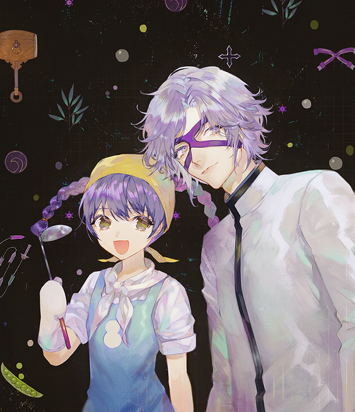 1boy 1girl :d apron bandana black_background blue_apron brown_eyes eye_mask gakuen_basara gakuran height_difference holding holding_ladle itsuki_(sengoku_basara) ladle looking_at_viewer mask open_mouth oven_mitts purple_eyes purple_hair school_uniform sengoku_basara shirt short_sleeves smile suishagoya takenaka_hanbee_(sengoku_basara) upper_body white_gakuran white_shirt yellow_bandana