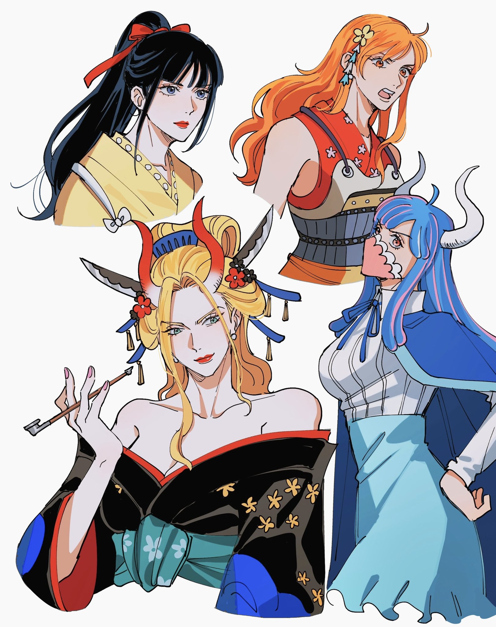1boy 3girls ahoge black_hair black_kimono black_maria_(one_piece) blonde_hair blue_cape blue_eyes blue_hair blue_skirt cape commentary hair_ornament hair_ribbon half_updo hand_on_own_hip high-waist_skirt highres holding holding_smoking_pipe horns japanese_clothes kanzashi kikunojo_(one_piece) kimono long_hair long_sleeves looking_at_viewer looking_to_the_side mask medium_hair mouth_mask multiple_girls nami_(one_piece) nami_(one_piece)_(wano) obi one_piece orange_eyes orange_hair pink_eyes ponytail red_horns red_kimono red_lips red_ribbon ribbon sash seirorath shirt sidelocks simple_background skirt sleeveless sleeveless_kimono smoking_pipe untranslatable_commentary ulti_(one_piece) white_background white_horns white_shirt yellow_kimono