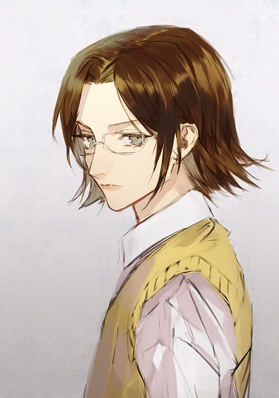 1boy brown_hair collared_shirt expressionless from_side gakuen_basara glasses grey_background grey_eyes looking_at_viewer male_focus mouri_motonari_(sengoku_basara) portrait school_uniform sengoku_basara shirt short_hair simple_background solo suishagoya sweater_vest white_shirt yellow_sweater_vest