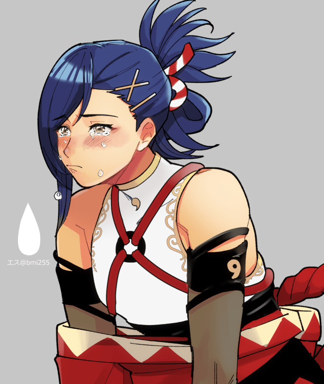 1boy bare_shoulders blue_eyes blue_hair closed_mouth crying crying_with_eyes_open dark_blue_hair esu_(b_r9) fire_emblem fire_emblem_engage folded_ponytail japanese_clothes kagetsu_(fire_emblem) male_focus nintendo solo tears yellow_eyes