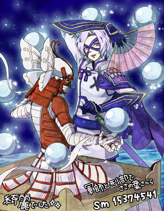 2boys :d armor bandaged_arm bandaged_chest bandaged_hand bandaged_head bandages black_sclera blue_background blue_gloves colored_sclera folding_fan gloves ha0810 hand_fan helmet holding holding_fan japanese_armor kabuto_(helmet) looking_at_viewer male_focus multiple_boys ootani_yoshitsugu_(sengoku_basara) open_mouth orb purple_eyes sengoku_basara short_hair shoulder_armor sitting smile takenaka_hanbee_(sengoku_basara) teeth upper_teeth_only white_eyes white_hair