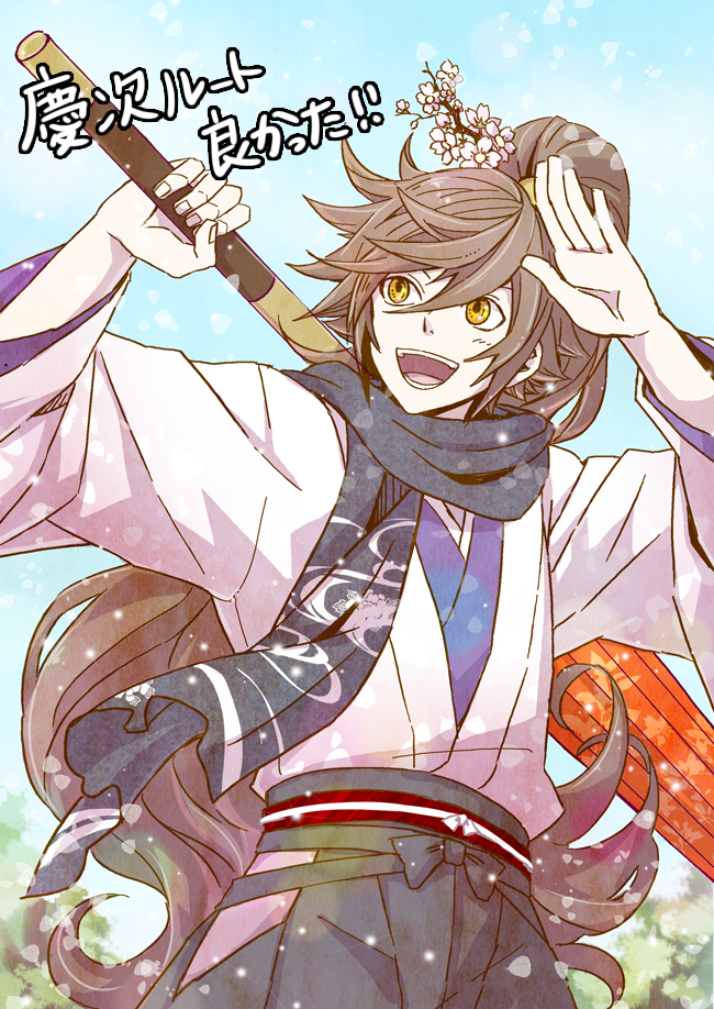 1boy :d arm_up black_hakama black_scarf blue_sky brown_hair cherry_blossoms cowboy_shot ha0810 hakama holding holding_umbrella japanese_clothes kimono long_hair maeda_keiji_(sengoku_basara) male_focus official_alternate_costume open_mouth outdoors pink_kimono ponytail scarf sengoku_basara sky smile solo umbrella yellow_eyes