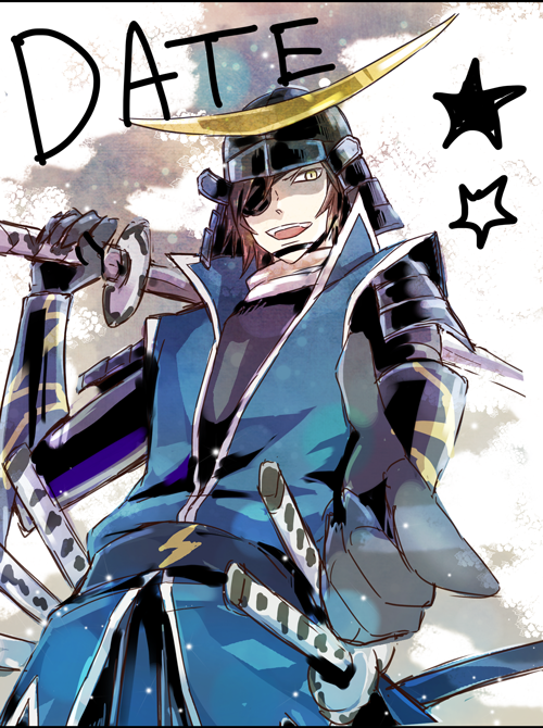 1boy :d armor black_gloves brown_hair character_name cowboy_shot date_masamune_(sengoku_basara) eyepatch gloves ha0810 helmet holding holding_sword holding_weapon japanese_armor kabuto_(helmet) katana looking_at_viewer male_focus open_mouth pointing pointing_at_viewer sengoku_basara short_hair slit_pupils smile solo star_(symbol) sword teeth upper_teeth_only weapon white_background yellow_eyes