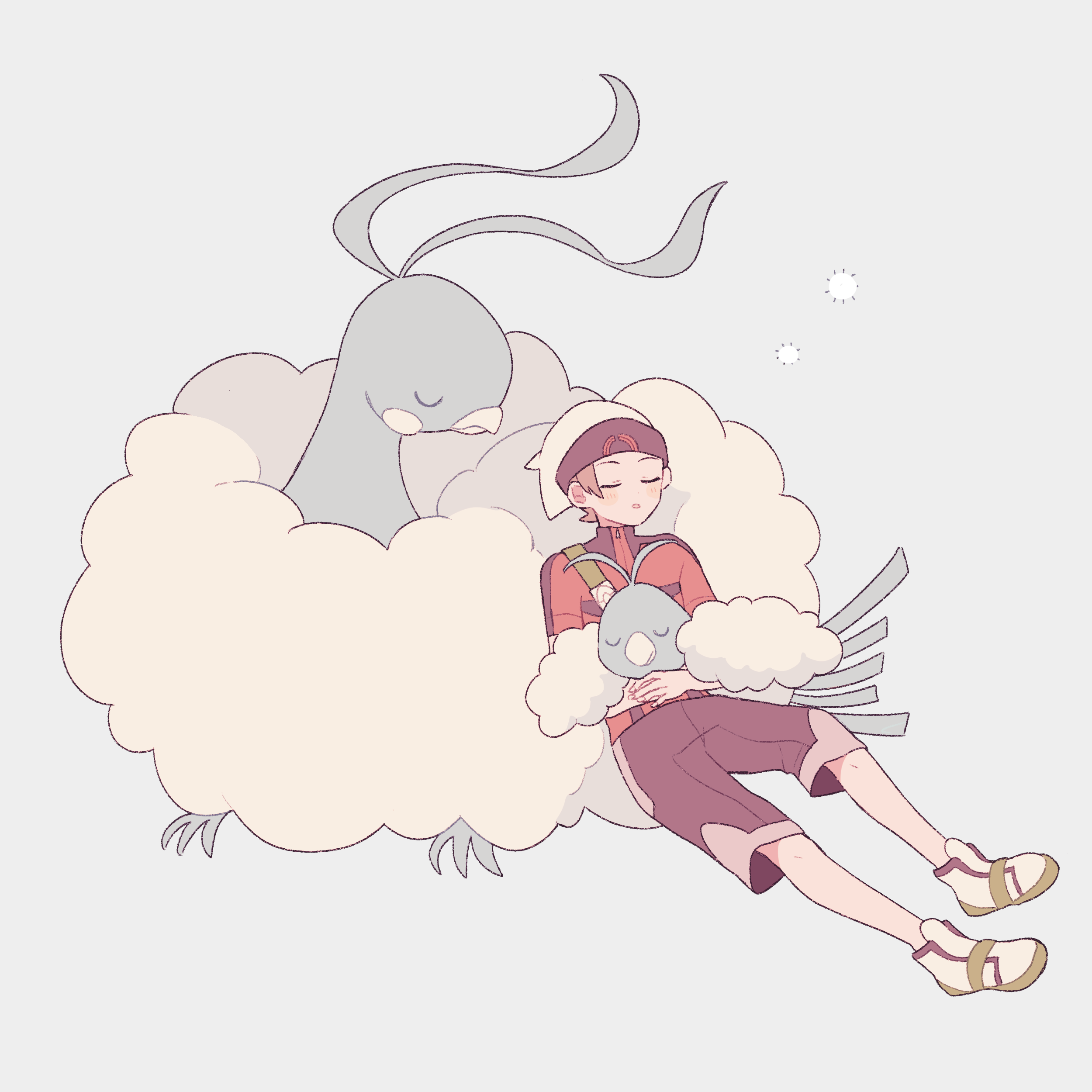 1boy absurdres altaria beak bird black_pants brendan_(pokemon) brown_hair closed_eyes commentary_request evolutionary_line fluffy gen_3_pokemon hat highres holding holding_pokemon nintendo pants parted_lips pokemon pokemon_(creature) pokemon_omega_ruby_and_alpha_sapphire ririco_(gnsn) shirt short_hair simple_background sitting sleeping swablu turtleneck turtleneck_shirt white_hat