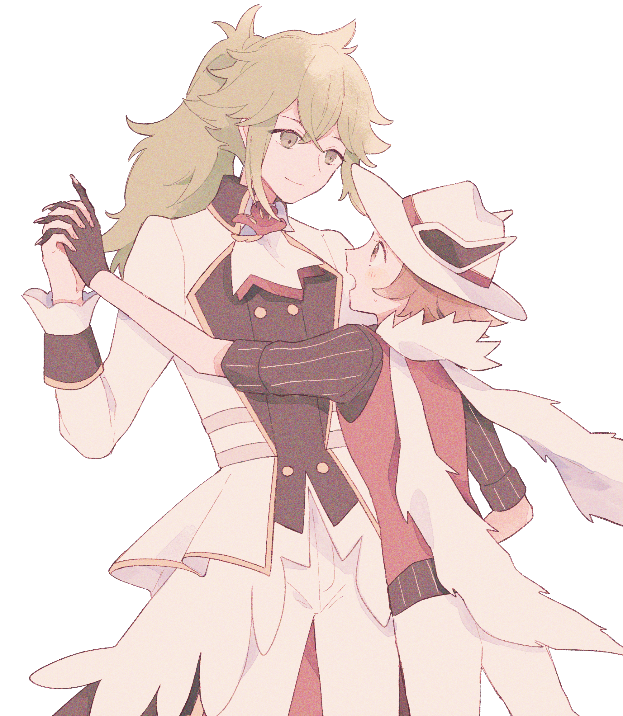 2boys age_difference alternate_costume ascot black_gloves blush brown_eyes brown_hair buttons closed_mouth crossed_bangs gloves green_eyes green_hair hair_between_eyes hand_up hat height_difference highres hilbert_(fall_2020)_(pokemon) hilbert_(pokemon) holding_hands jacket long_hair long_sleeves looking_at_another male_focus multiple_boys n_(anniversary_2021)_(pokemon) n_(pokemon) nintendo official_alternate_costume open_mouth pants pokemon pokemon_masters_ex ponytail red_vest ririco_(gnsn) short_hair short_sleeves smile vest white_ascot white_hat white_jacket white_pants yaoi