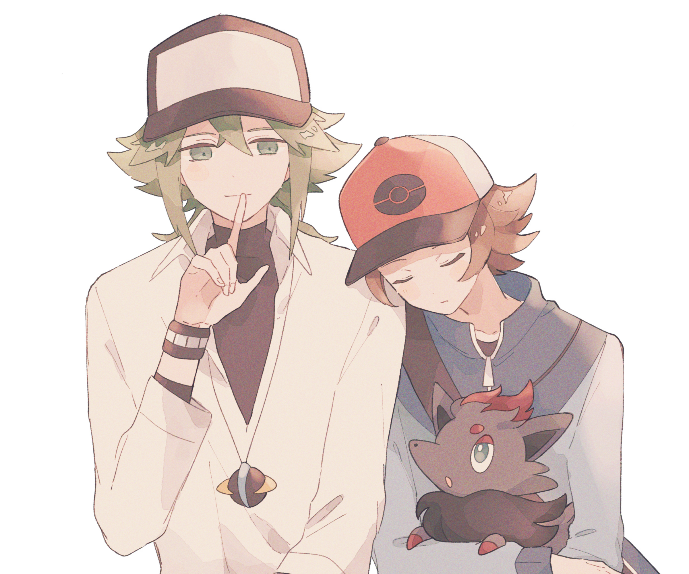 2boys animal_ears baseball_cap black_fur black_hat blue_jacket brown_hair closed_eyes closed_mouth collarbone collared_shirt commentary_request finger_to_mouth gen_5_pokemon green_eyes green_hair hat highres hilbert_(pokemon) holding holding_pokemon index_finger_raised jacket long_hair long_sleeves male_focus multiple_boys n_(pokemon) nintendo poke_ball_print pokemon pokemon_(creature) pokemon_black_and_white red_fur red_hat ririco_(gnsn) shirt short_hair sleeping sleeping_on_person sleeping_upright two-tone_fur undershirt upper_body white_shirt wristband zipper_pull_tab zorua