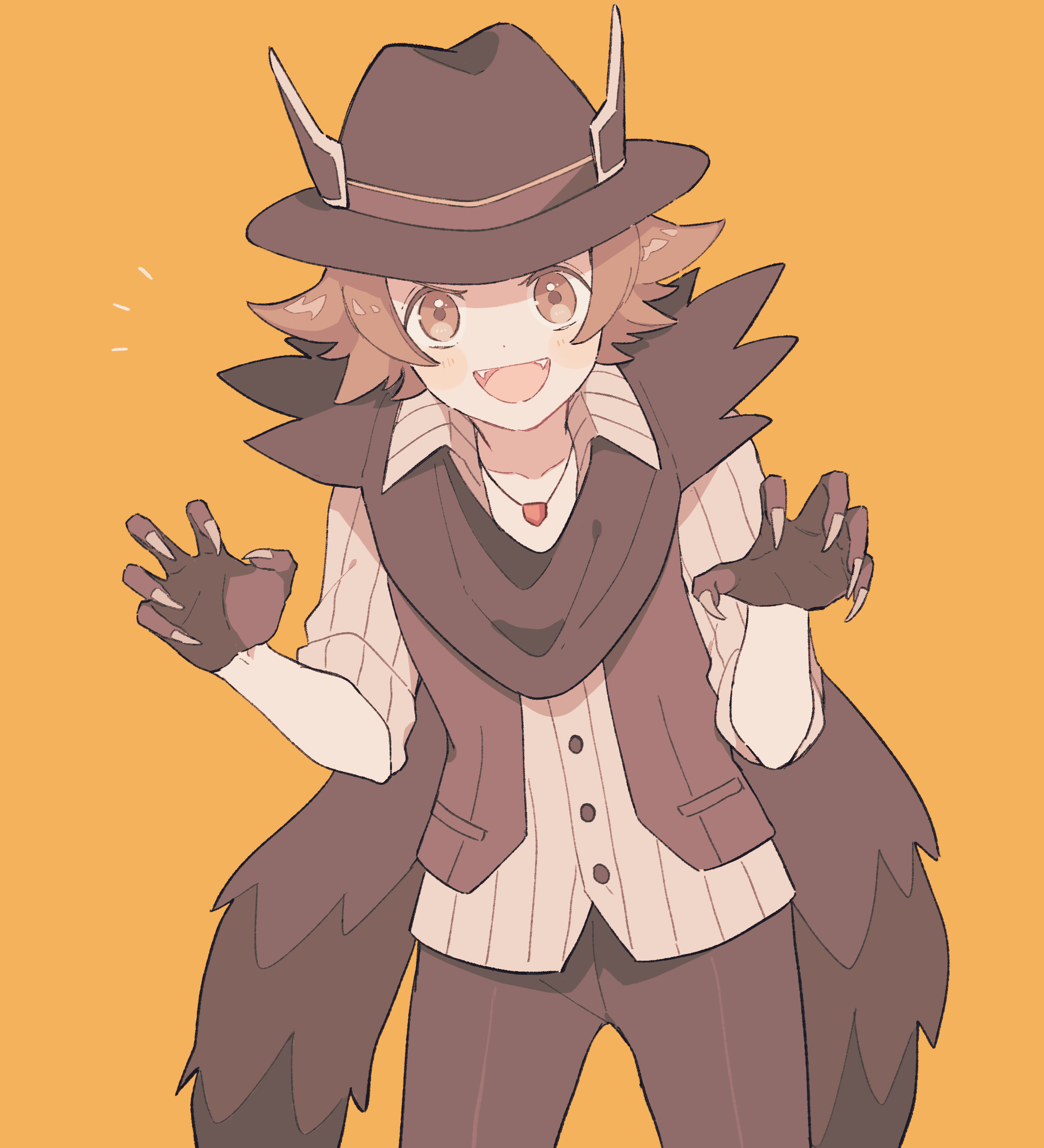 1boy :d alternate_costume black_gloves black_hat black_pants black_scarf blush blush_stickers brown_eyes brown_hair brown_vest buttons claw_pose claws collared_shirt commentary_request cowboy_shot fangs gloves hat highres hilbert_(fall_2020)_(pokemon) hilbert_(pokemon) jewelry looking_at_viewer male_focus necklace nintendo notice_lines official_alternate_costume open_mouth orange_background pants pokemon pokemon_masters_ex ririco_(gnsn) scarf shirt short_hair simple_background smile striped_clothes striped_shirt vertical-striped_clothes vertical-striped_shirt vest white_shirt