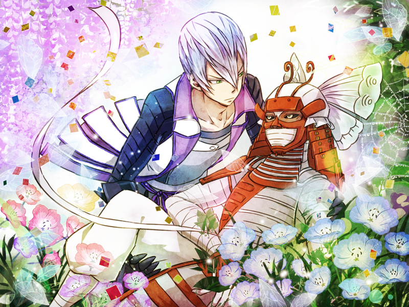 2boys armor bandaged_arm bandaged_head bandages black_sclera colored_sclera feet_out_of_frame flower green_eyes ha0810 hand_on_another's_arm hand_on_another's_leg helmet ishida_mitsunari_(sengoku_basara) japanese_armor kabuto_(helmet) looking_at_another male_focus multiple_boys ootani_yoshitsugu_(sengoku_basara) sengoku_basara short_hair white_eyes white_hair